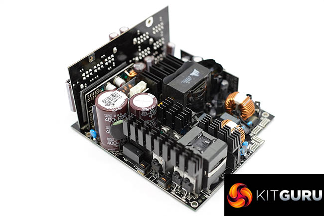 Internally Corsair haven't cut corners, and they have adopted high grade 105c Japanese capacitors throughout the build – from brands such as Nippon Chemi Con. Even though efficiency levels reach 96.7%, Corsair have included multiple small heatsinks across the PCB to ensure key components cool adequately with minimal, or no airflow.