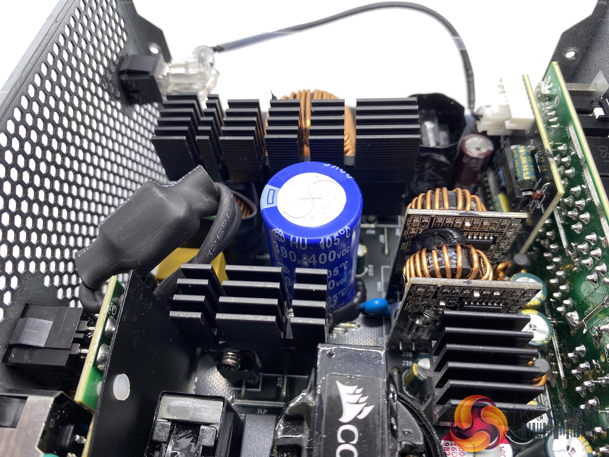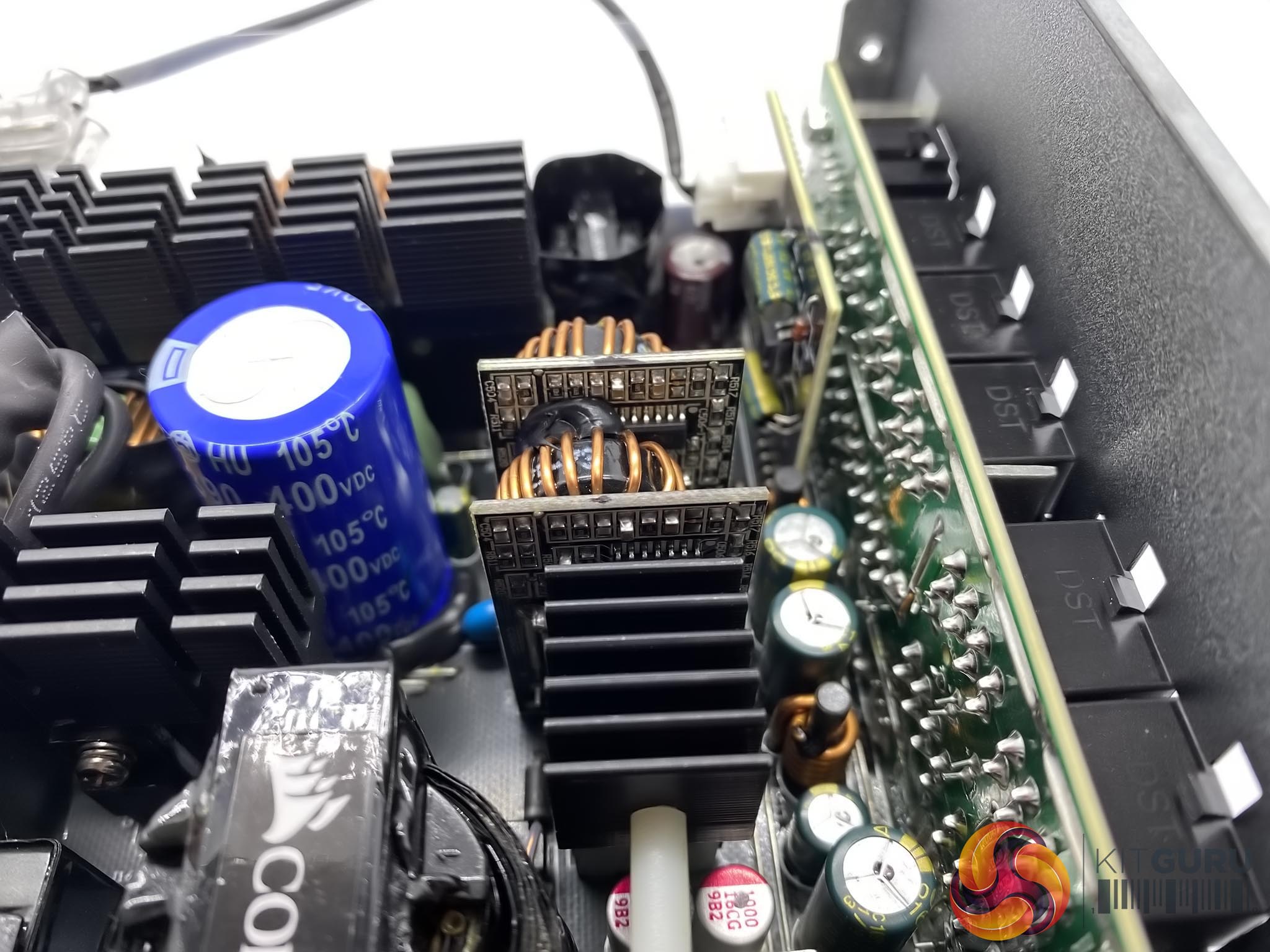 Corsair have partnered up with HEC for this unit. This is a half bridge topology with an LLC resonant converter. We are happy to see Corsair using a 105c rated Japanese capacitor in the primary stage , rated 390uF at 400V. The electrolytic filtering caps on the secondary side are supplied by TEAPO. Soldering quality throughout is really good. There is a pair of bridge rectifiers capable of handling 16 amperes of current.