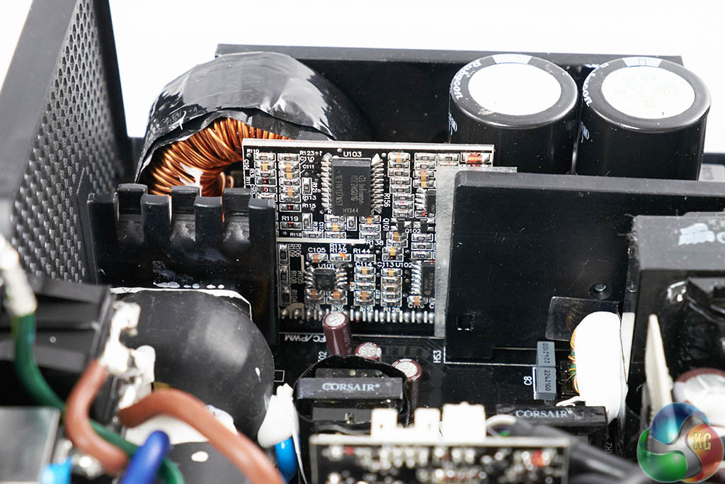 The design is using high grade 105c Japanese rated capacitors throughout. Primary capacitors are from Rubycon, the finest quality that money can buy. Interesting to see that while Seasonic use three 330uF 420V capacitors in their latest 1050WXP3 unit, Corsair are using two 400v 470uF capacitors in the HX1000i.