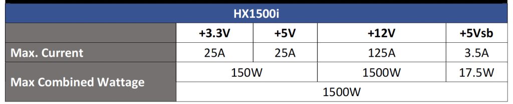 The HX1500i can deliver 25A across the +3.3V and +5V rails. The primary +12V rail can handle a whopping 125A – which is considerable.