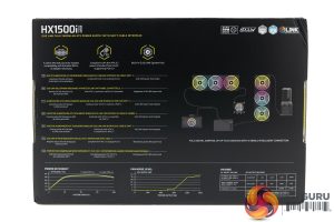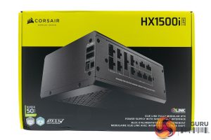 Corsair ship the HX1500i in one of their famous yellow accented boxes. The name of the product is listed top right, and they include a photograph of the supply in the center with a logo showing support for Nvidia 50 series, as well as two Cybenetics certification badges.