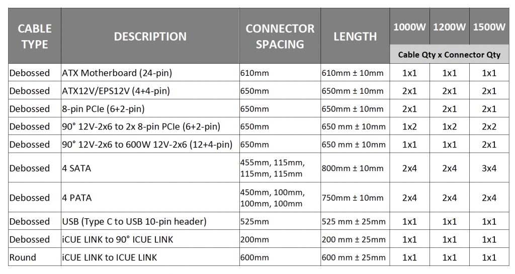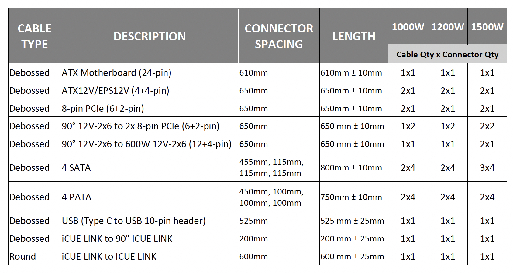 The table above shows all the cabling between the three power output capacities of the HXi Shift power supplies. Length and connector spacing on all the cables is perfectly fine. The primary cables are all 16-18AWG.