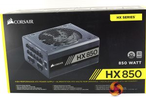 The Corsair HX850 ships in a dark box with bright yellow accenting. The front highlights the capacity, 10 year warranty and new Platinum efficiency levels.