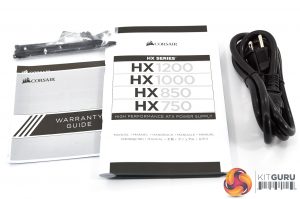 Inside the box, alongside the power supply is a user manual, regional specific power plug, warranty guide, and a soft bag of modular cables. Corsair also include some cable ties, case badge and mounting screws.