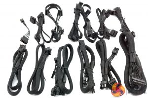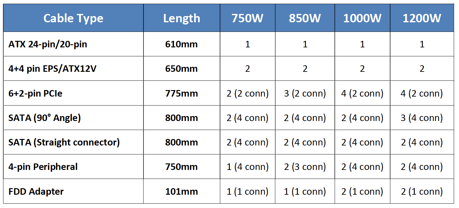 The table above shows all the cable configurations across the new HX Series of power supplies. I feel 6 PCIe connectors (across three cables, with two on each cable) is more than enough and will easily sate the demand for multiple graphics cards. I always like to see a mixture of straight and 90 degree angled SATA connectors, as it can help the build phase in some chassis.