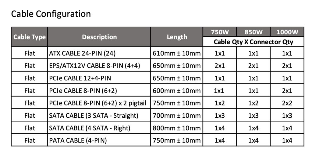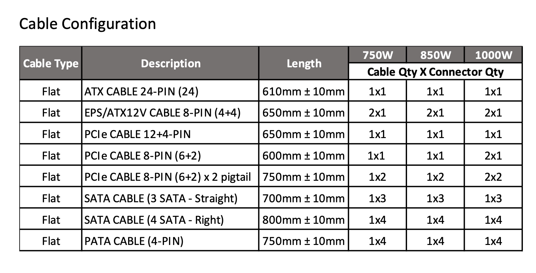 As expected, the cables supplied with the 1000W unit should cover any building requirements for the majority of users, including a PCIe 5.0/12VHPWR connector. The cables are long enough for even the biggest cases available on the market today.