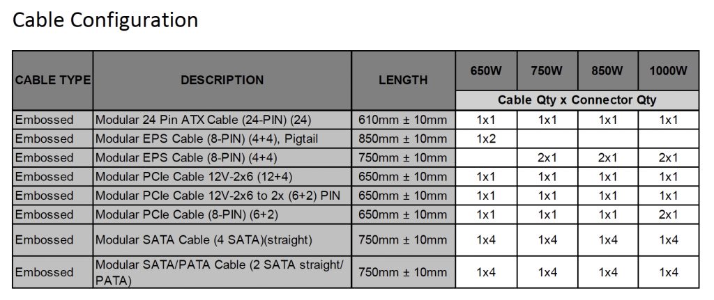 The cables are nice – Corsair called them 'embossed'. I call them individually sleeved. They are pretty nice though. The 1000 watt unit has plenty of cables to power high end gaming systems.
