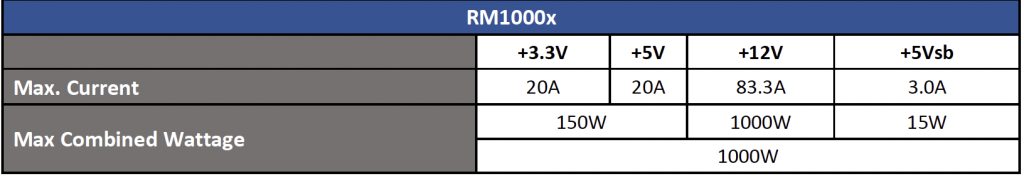 The RM1000x delivers 20A to both +3.3V and +5V rails. The primary +12V rail can handle up to 83.3A – this is an increase from the 70.8A of the RM850x.