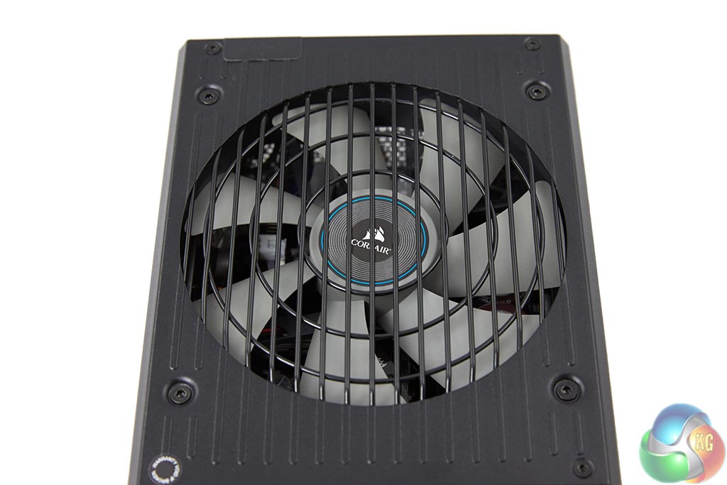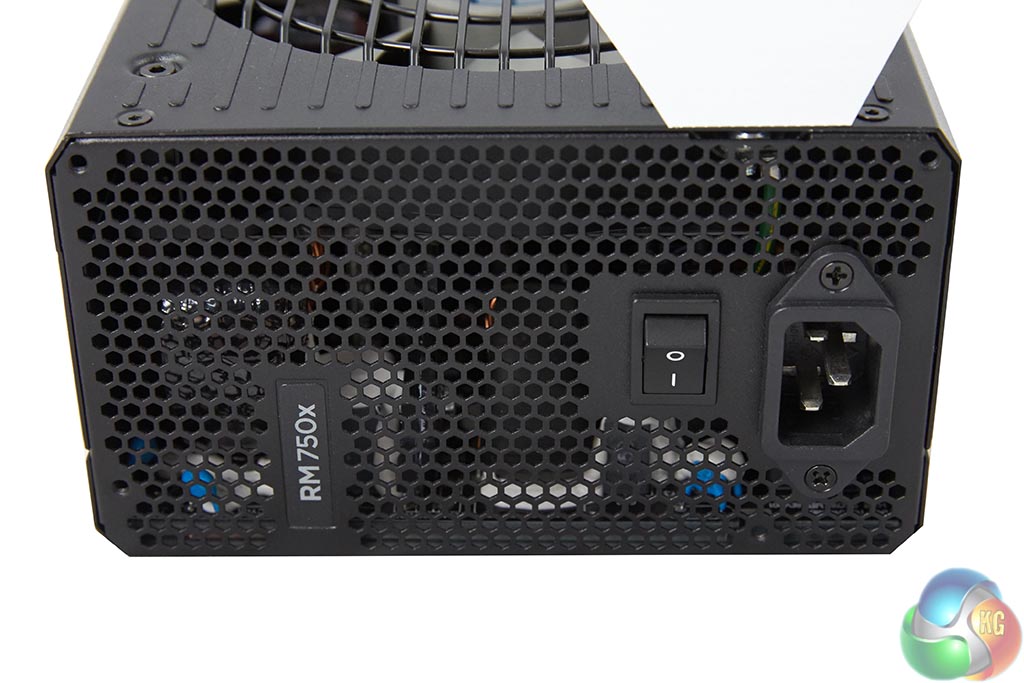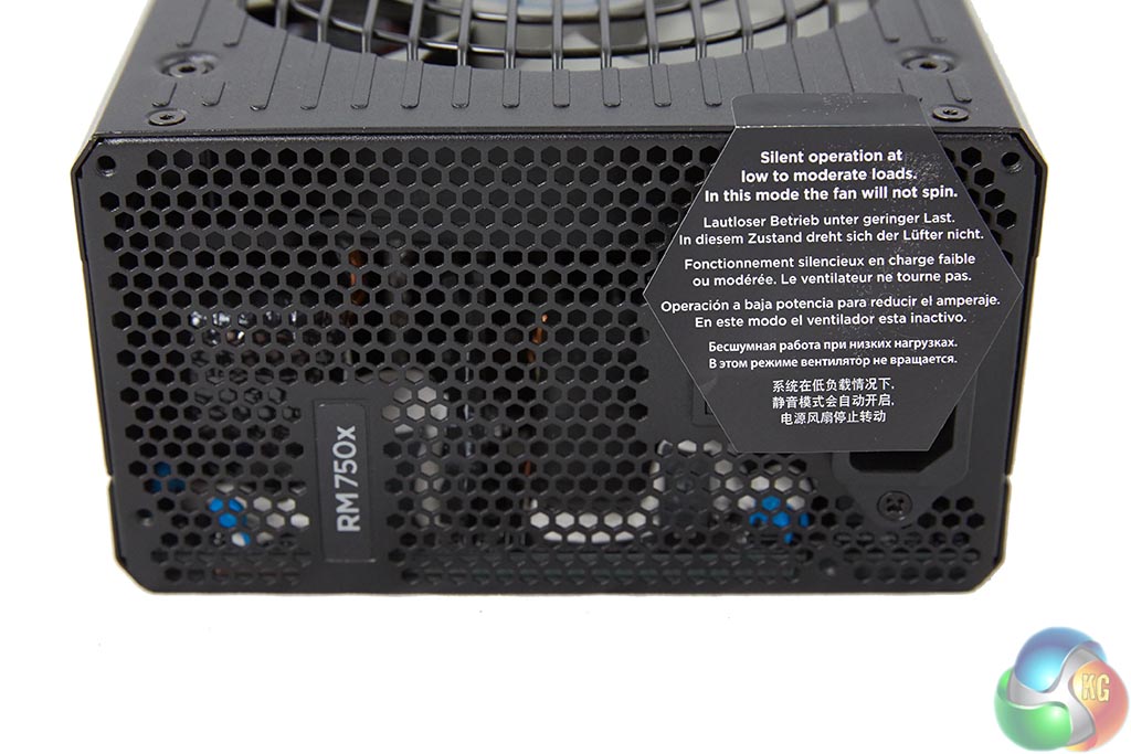 One side of the power supply is vented to help with heat dissipation and air flow. A power button and connector are positioned at the side. Corsair place a sticker over the cable connector to alert the user that the fan is not likely to spin at idle to moderate loads.