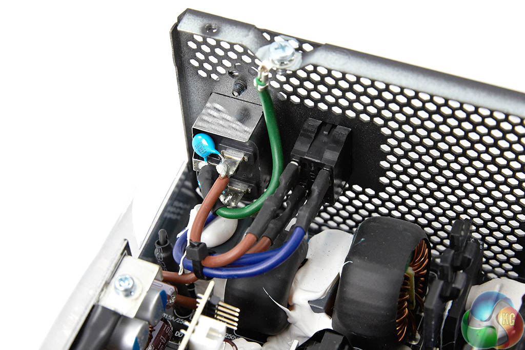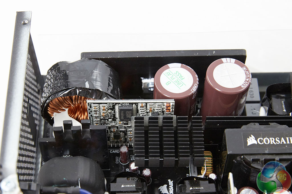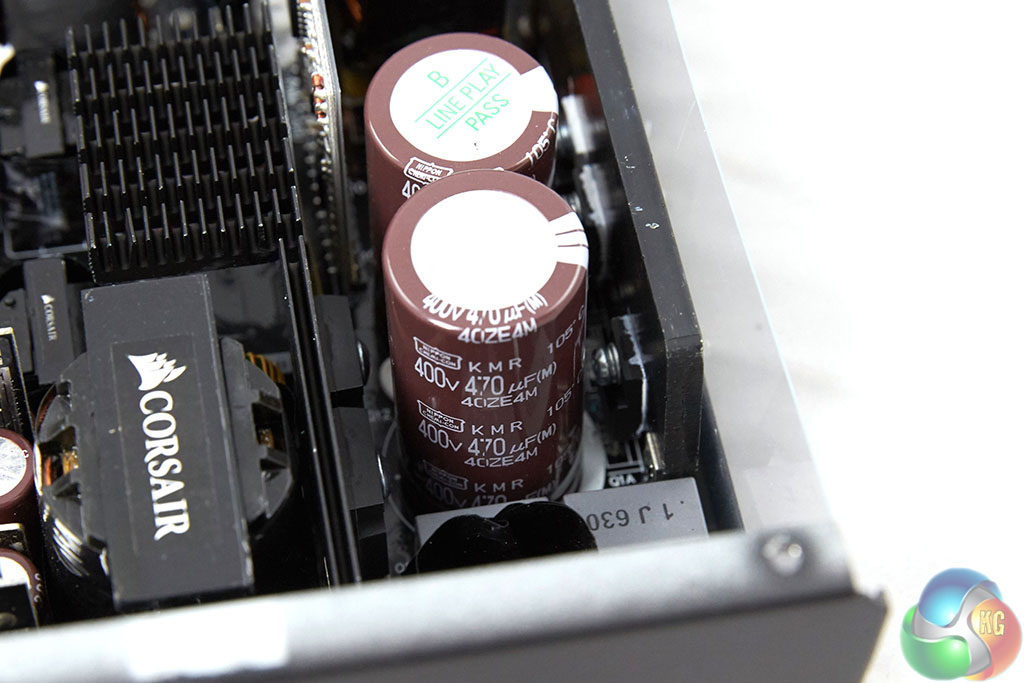Corsair are using 105c rated Japanese capacitors on both primary and secondary stages. In the primary stage there are two different sized KMR series Nippon Chemi Con capacitors – one is rated 400v 470uF and the other 400v 390uF. This brings the total to 860uF.