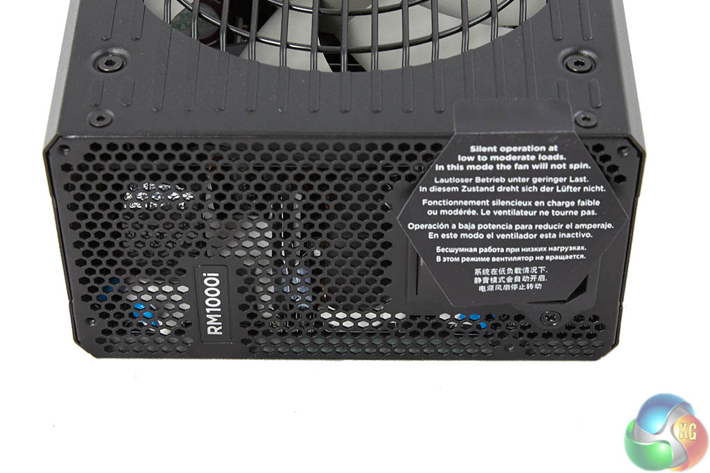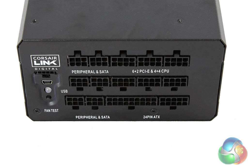 The modular bay is a three row implementation (750 watt model is two rows) – clearly labelled to make the build phase as straightforward as possible. The digital link connector is located in a separate panel at the side. As the sticker explained – the fan in this unit is often not spinning at all under general load conditions – Corsair have therefore thoughtfully included a ‘fan test’ button so the user can check the fan is actually working.