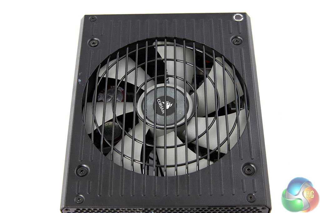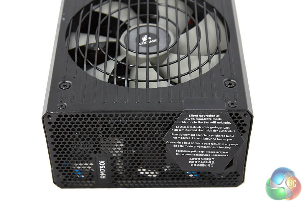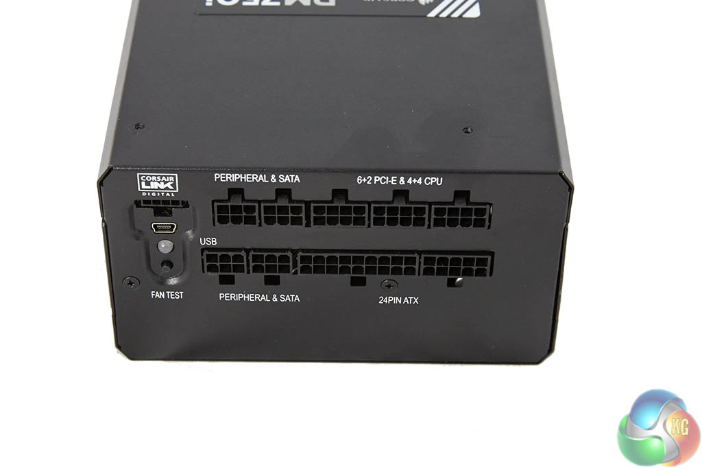 The modular bay is a two row implementation – clearly labelled to make the build phase as straightforward as possible. The digital link connector is located in a separate panel at the side. As the sticker explained – the fan in this unit is often not spinning at all under general load conditions – Corsair have therefore thoughtfully included a ‘fan test' button so the user can check the fan is actually working.