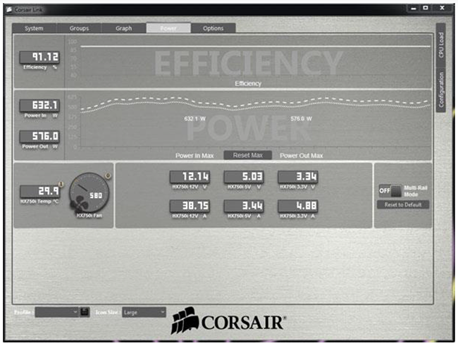 The Corsair Link software can change the RMi power supply DC output configuration from the default setting of multiple +12V rails to a single +12V rail. The RMi series can deliver all of their available power over the +12v rail.