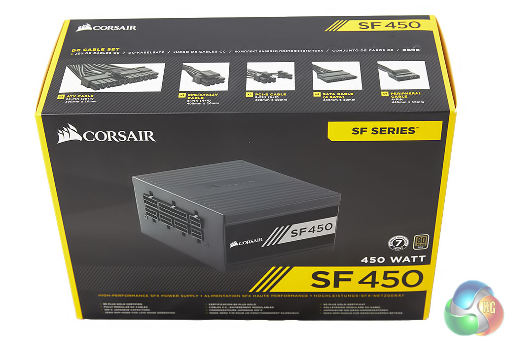 The Corsair box artwork is effective and highlights the SF450 on the front, with yellow accenting. Various specifications are shown around the box.