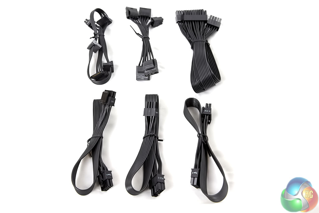 The power supply itself has no hardwired cables, so all the cables are flat and modular, as shown above. These are easy to route to build a neat system. Critical if you are building a space restricted SFX system. There are two 6+2 PCI e Cables to cater for a high end graphic card, or two lower specified models in Crossfire, or SLi configurations.
