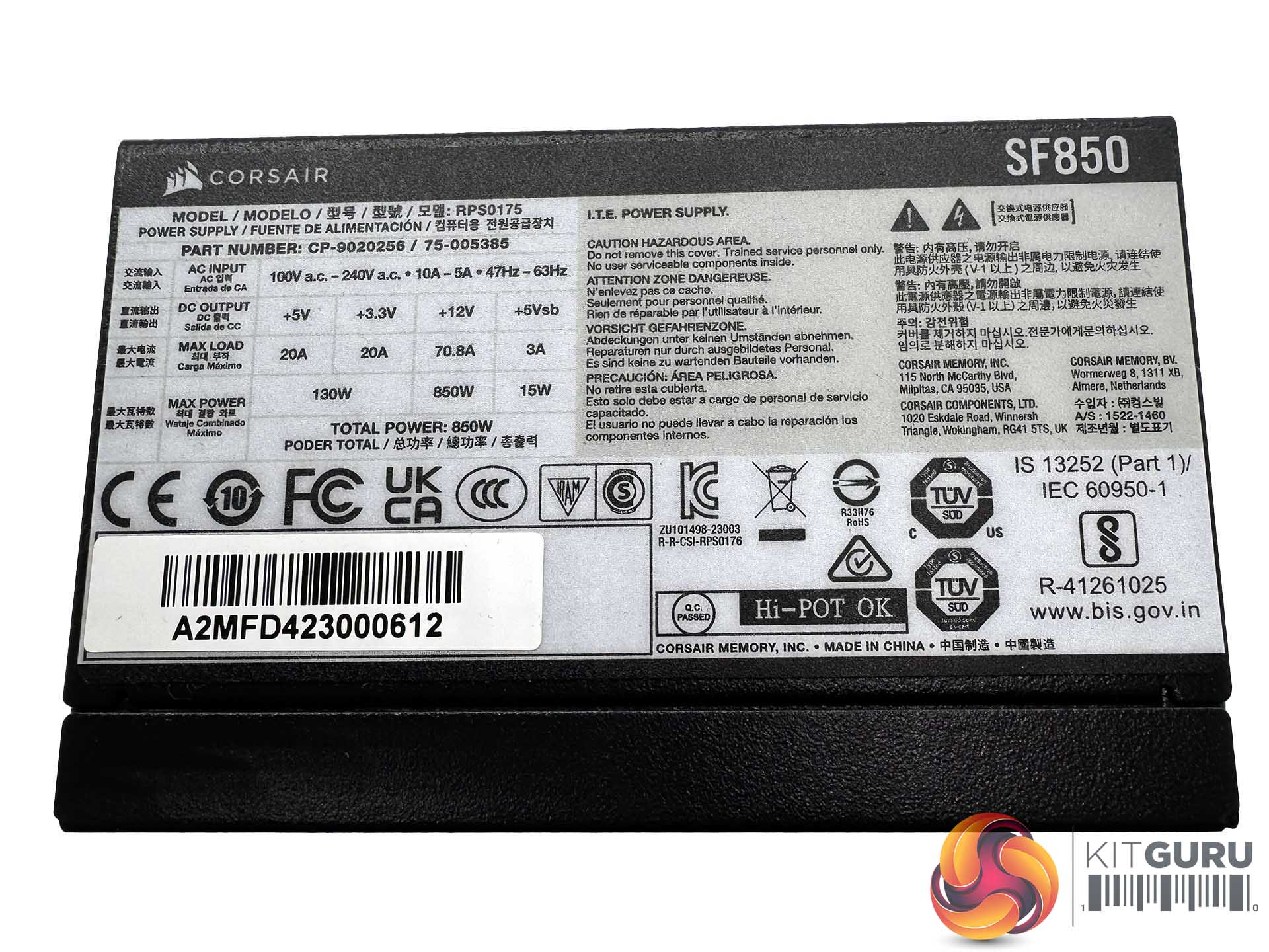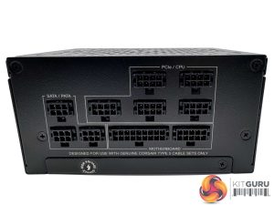 The power sticker shows that this unit can deliver 70.8A via the +12 rail (down from 83.3A on the 1000W unit). The minor +3.3V and +5V rails can deliver 20A. Corsair have removed the -12V rail from this power supply to increase efficiency and to remove some costs. Technically there really is no need for this anyway in 2024.