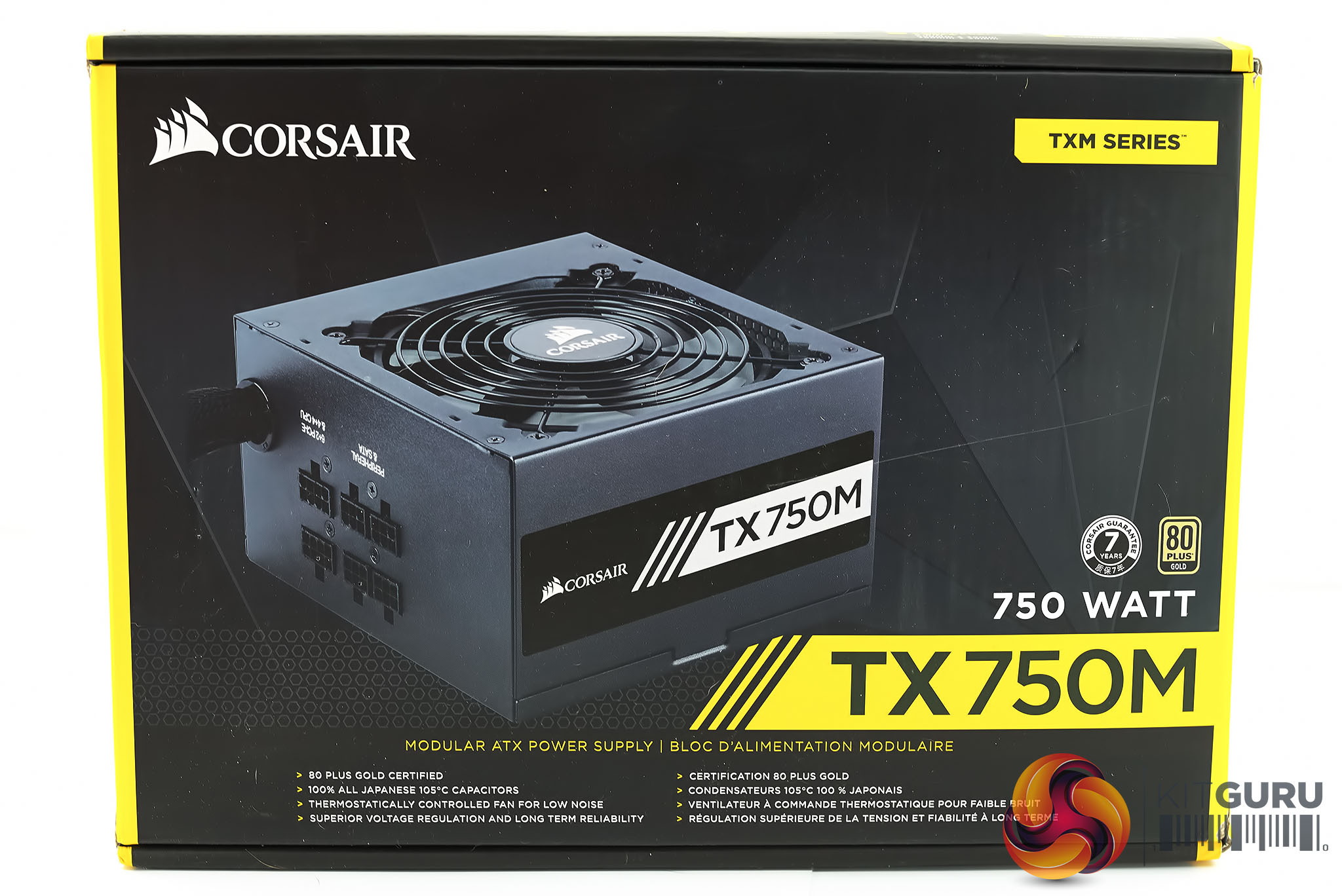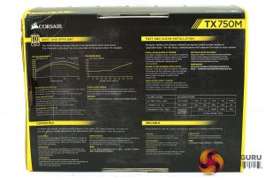 The Corsair TX750M arrives in a large box accented with yellow panels. A high resolution image of the power supply is shown on the front of the box along with some specifications such as the 80 Plus Gold Certification and 7 year warranty.