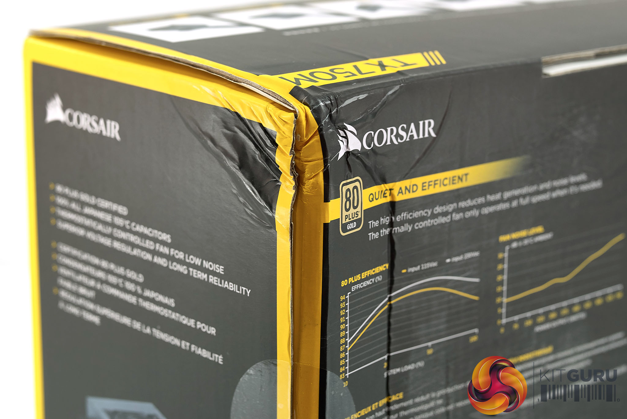 The rear of the box highlights the efficiency levels and fan noise levels. Our box was very much the worse for wear when it arrived with us from Asia. Clearly Messi and Ronaldo decided to have a kick about before UPS moved it through Europe. It just goes to show how important the box protection can be – the power supply was fortunately unscathed inside.