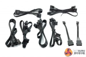 Above (left) the hard wired ATX (sleeved) and CPU cable. Above (right) – the modular cables which are all flat ribbon style for ease of routing.