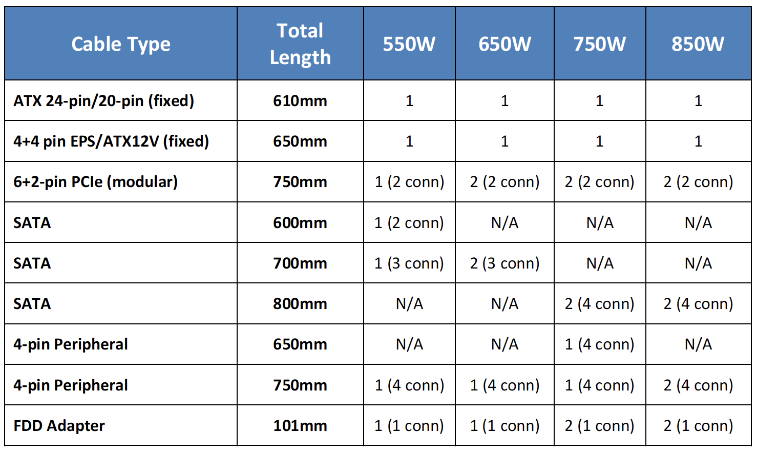 Above, the cable breakdown chart of the full range of new TX-M Gold rated power supplies.