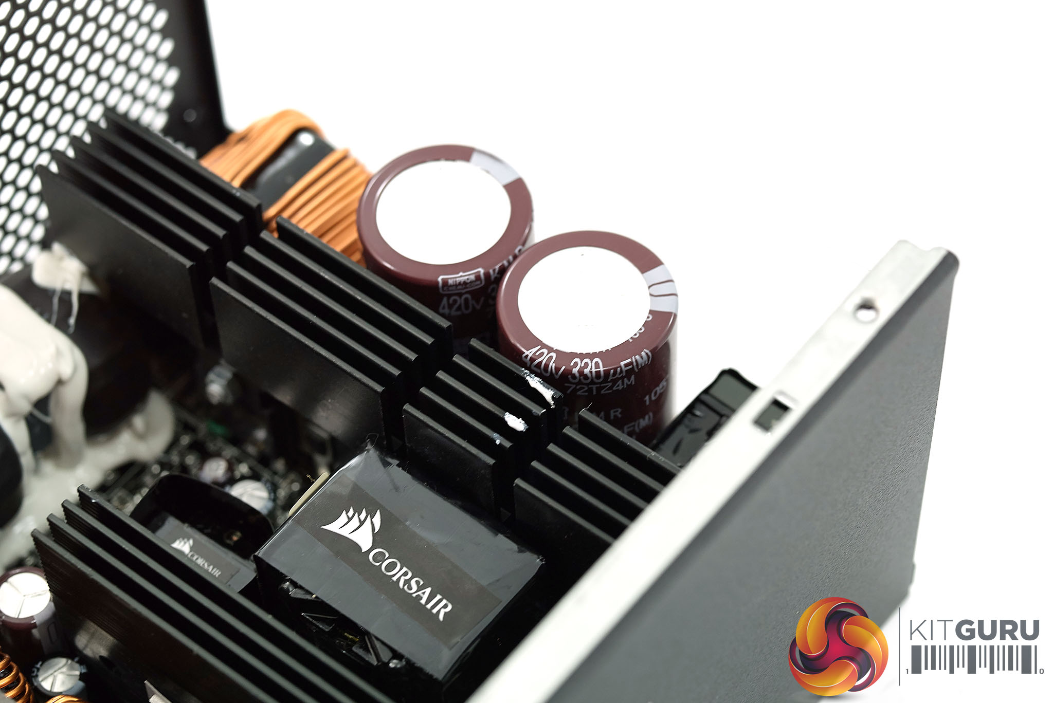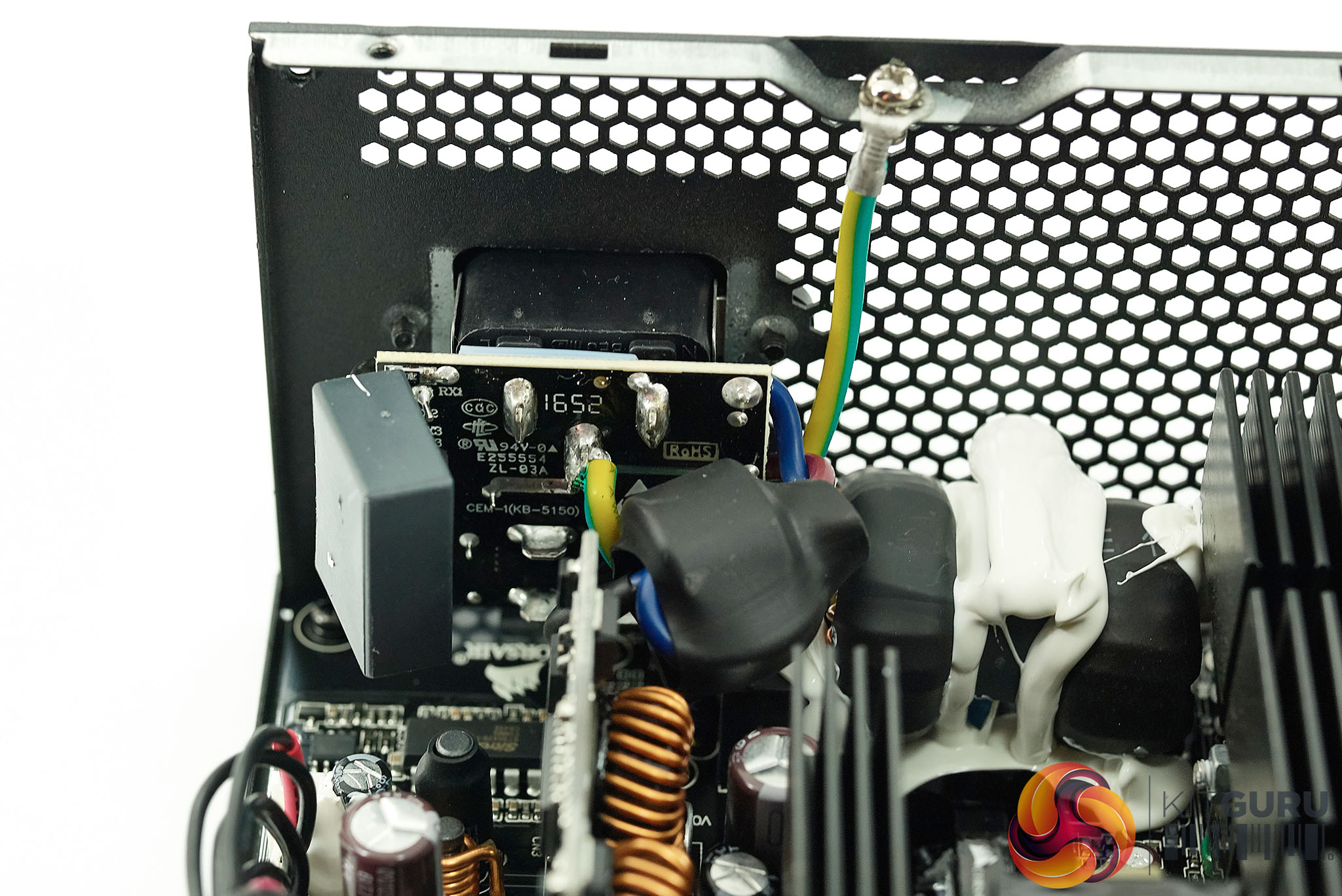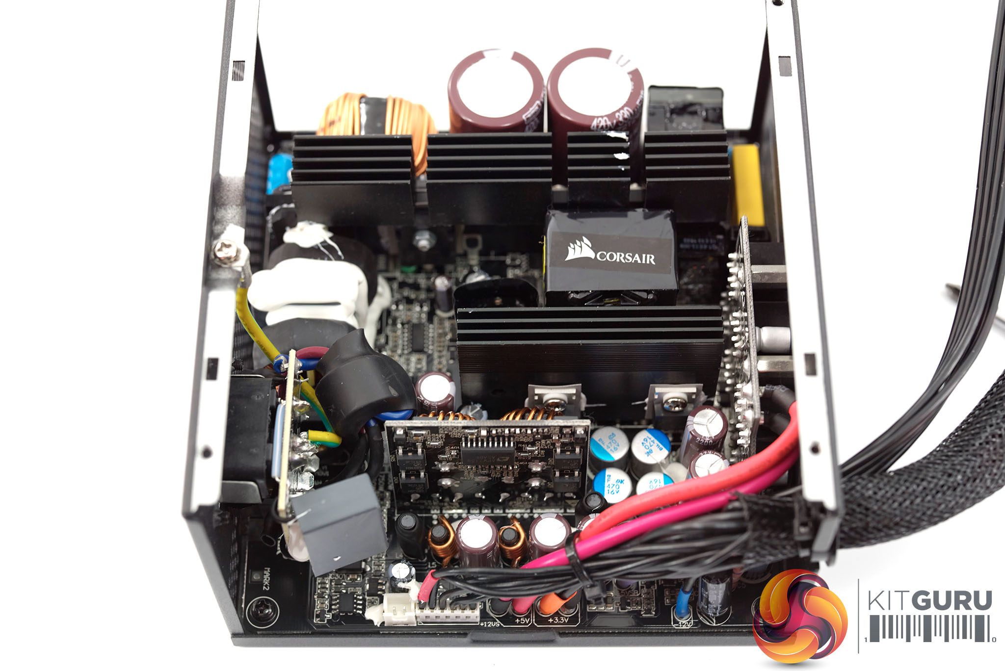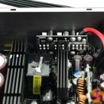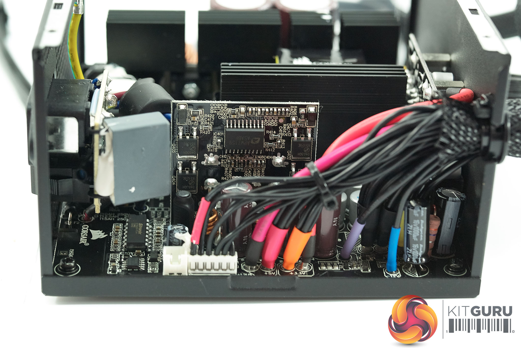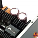 Corsair are using Japanese capacitors on both primary and secondary stages, which is always good to see. The two primary caps are high grade Nippon Chemi Con, 105c rated, from their excellent KMR series. These individual caps are rated 420v 330uF, for a total of 660uF output. This is a reasonably healthy output for a 750 watt power supply.