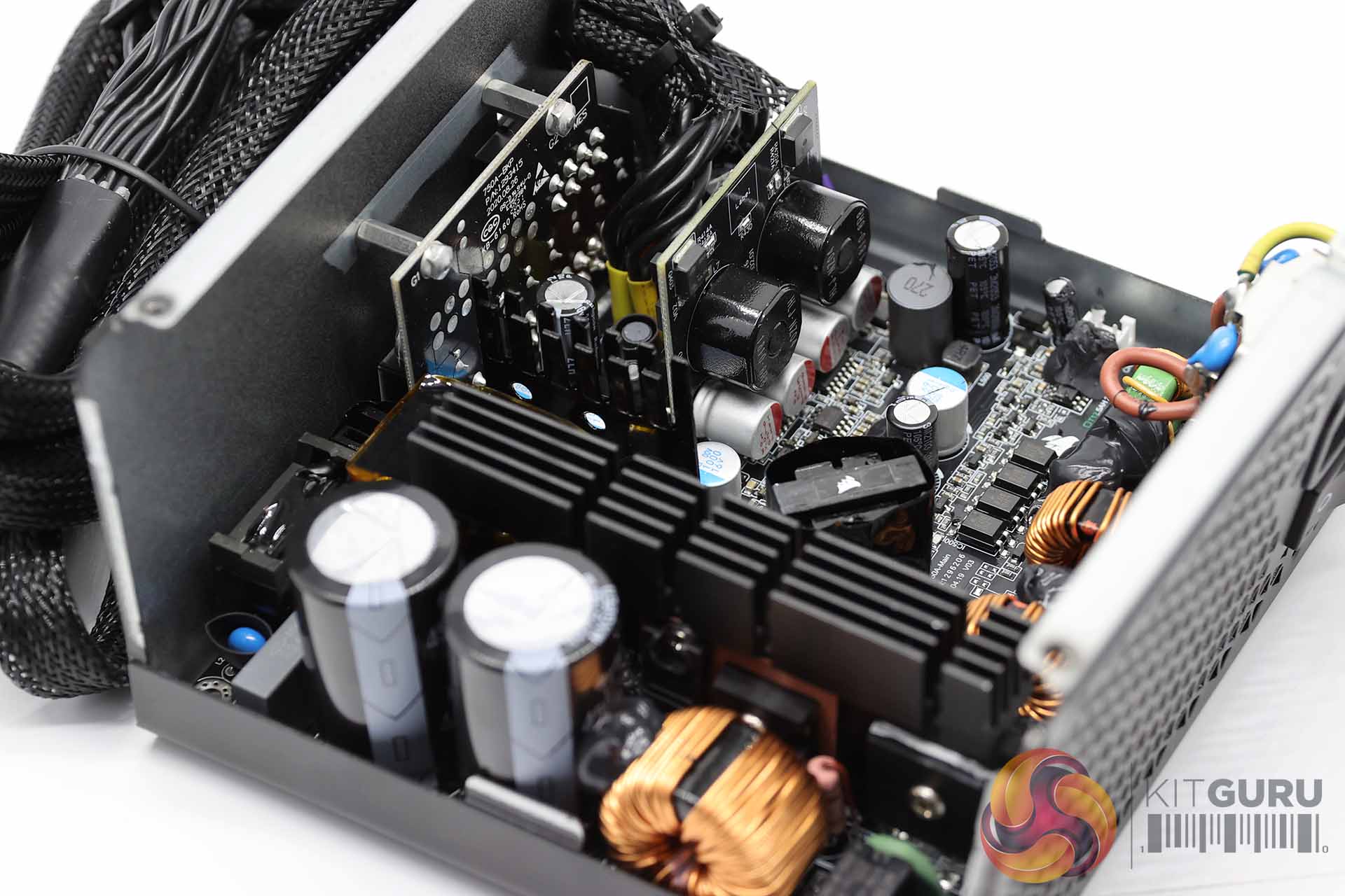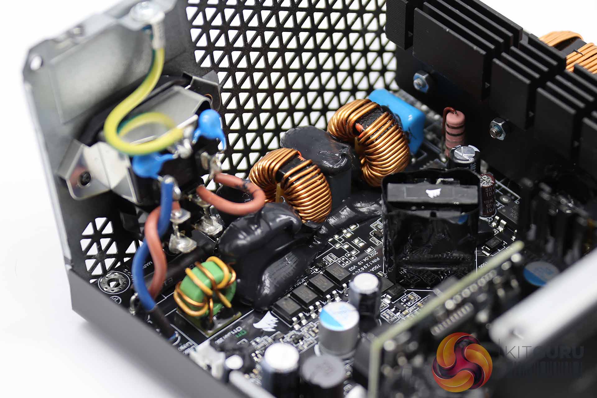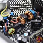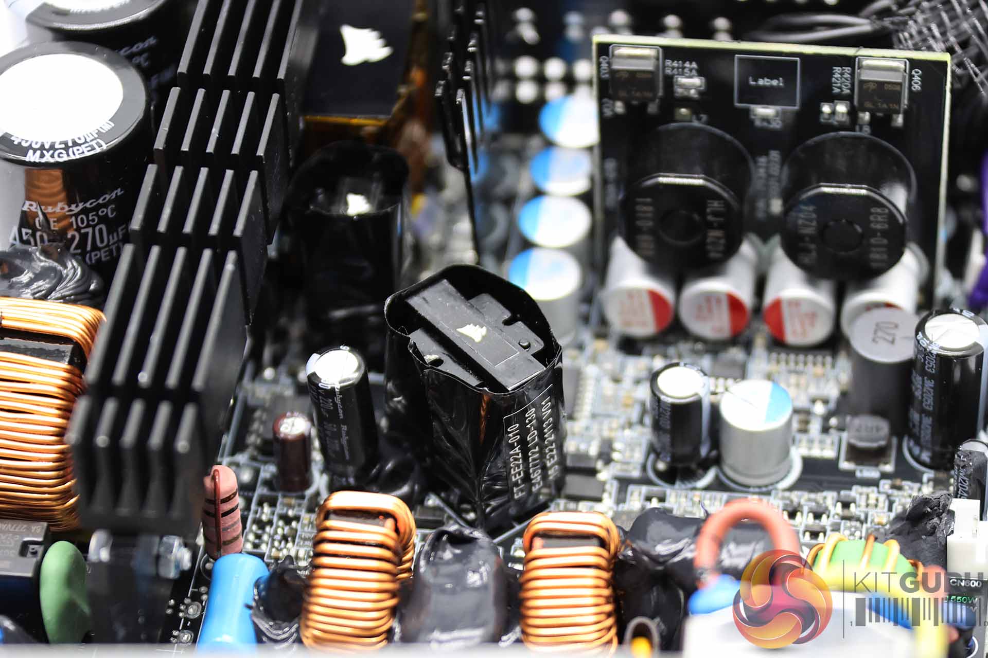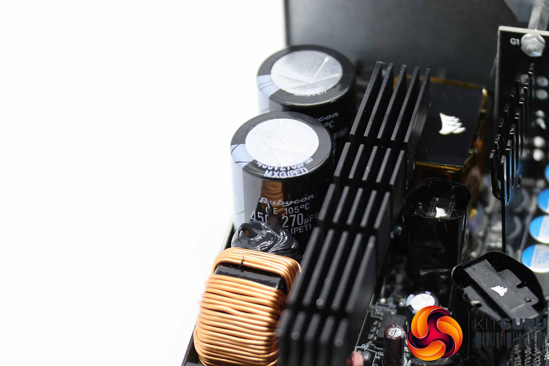 Corsair have partnered up with Great Wall for this unit. It adopts a Resonant LLC topology with DC to DC conversion. It is very impressive to see Corsair using high grade Japanese 105C Rubycon capacitors in the primary stage – two rated 450V 270uF for a total of 520uF output capacity. There are several rows of heatsinks inside the unit to aid with cooling from the fan above. Soldering on the PCB is decent across the board.