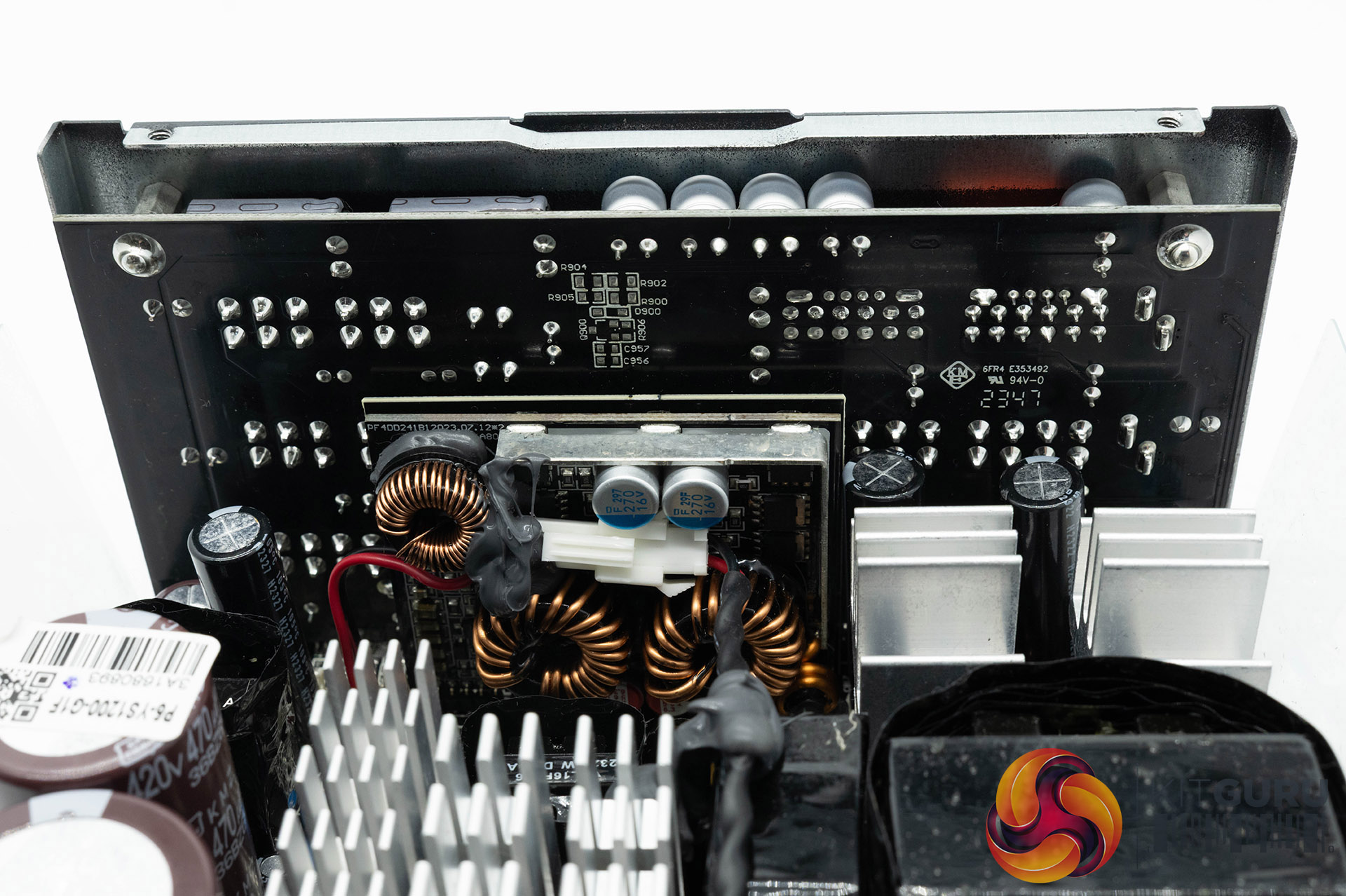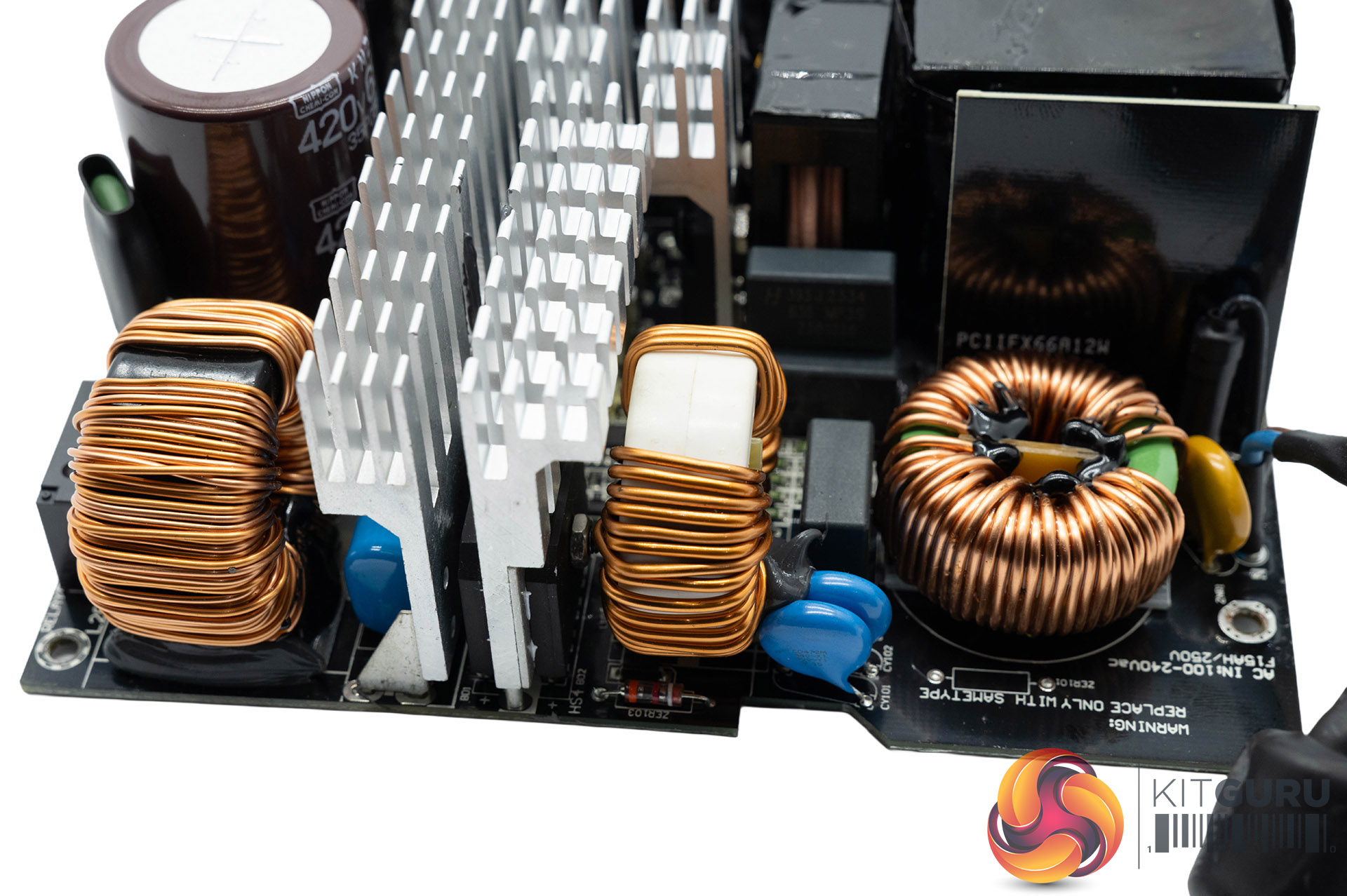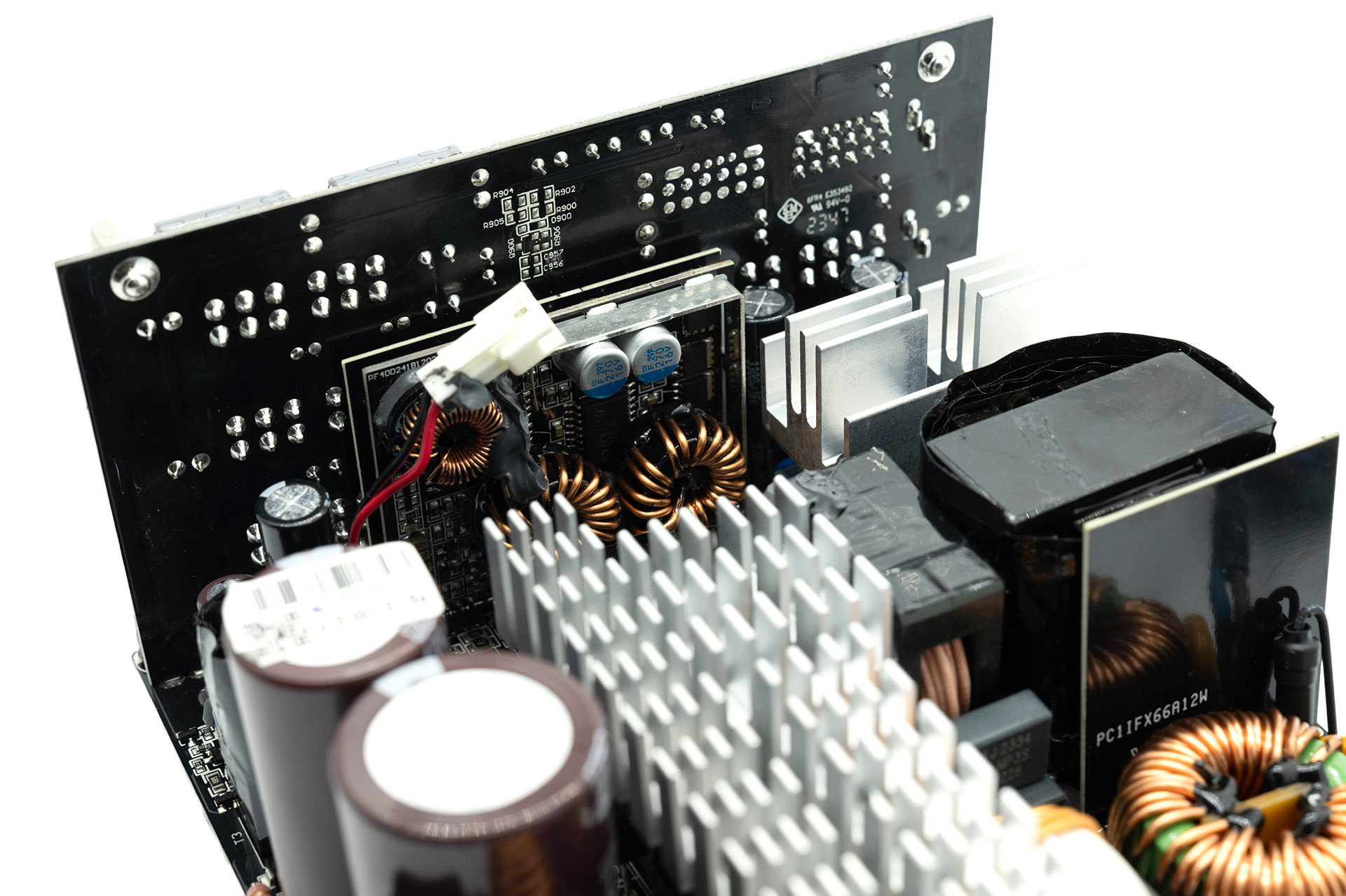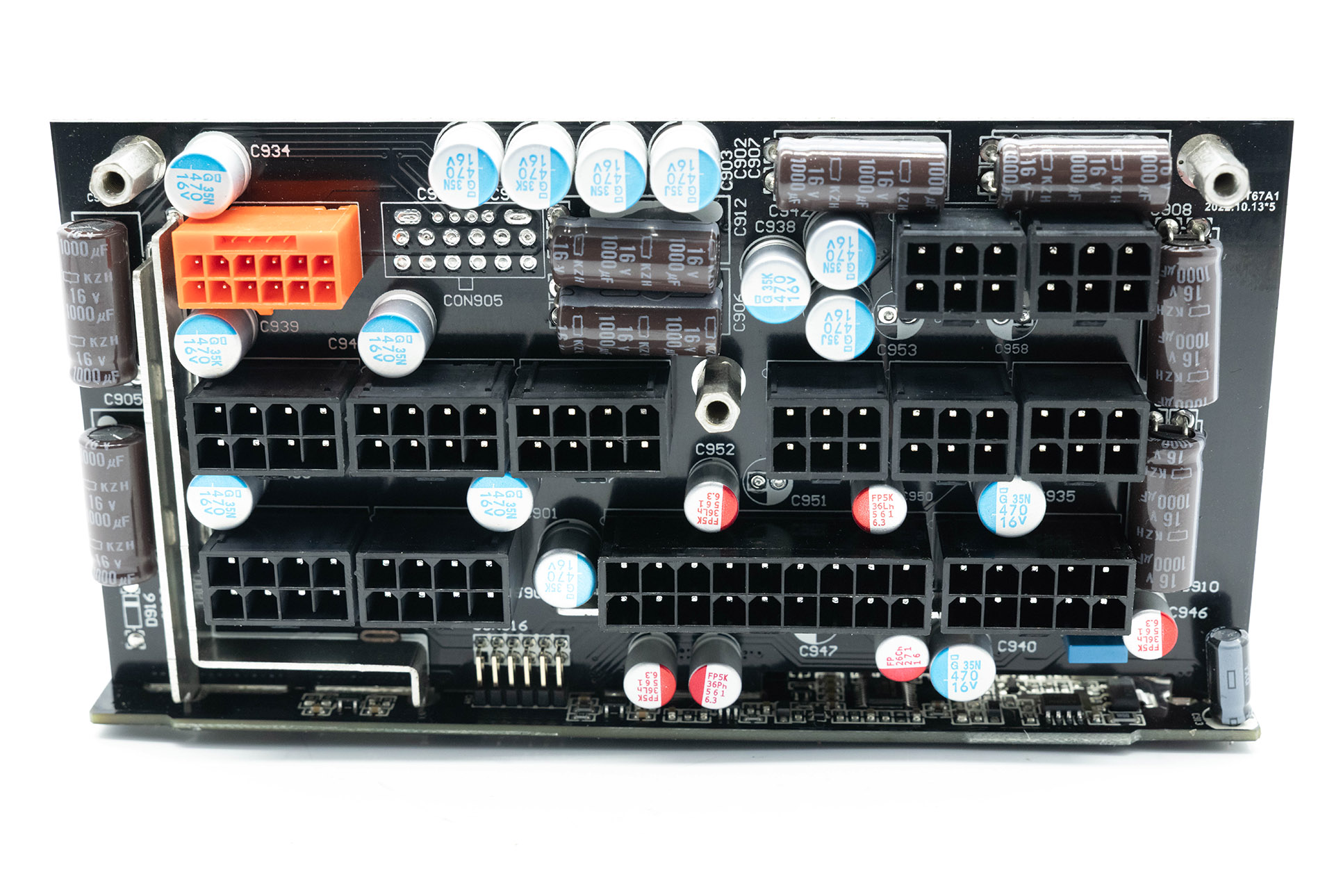 The topology of the unit is APFC, Half Bridge and LLC converter. The secondary side is synchronous rectification with DC-DC converters. Other electrolytic filtering capacitors on the board are from companies such as Nippon Chemi Con, Nichicon and Rubycon.
