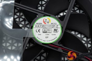 This design uses a very highly regarded Hong Hua 135mm Fluid Dynamic Bearing fan (Model: HA13525H12F-Z). We often see these fans in Seasonic power supplies.