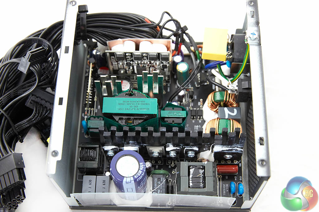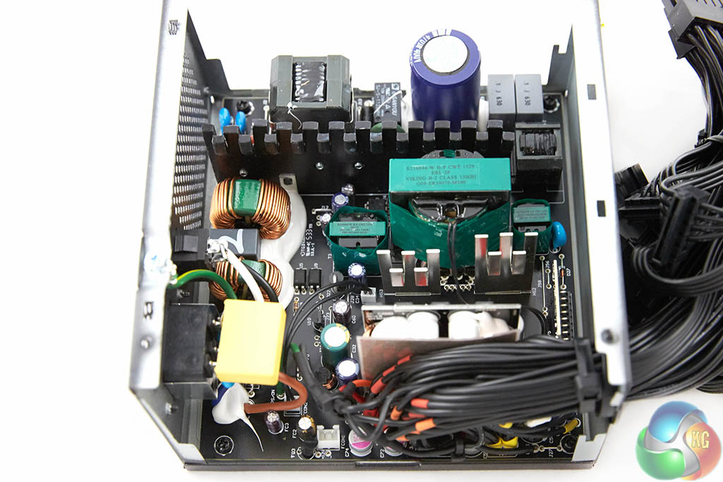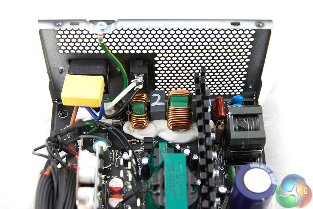 The filtering stage starts at the AC input receptacle and continues onto the main PCB. They are using a double EMI filter to try and stablise the voltages. The bridge rectifier has its own heatsink with another heatsink close by on the PFC power components and primary switching transistors. Wiring on the board varies, but some areas could certainly be better.