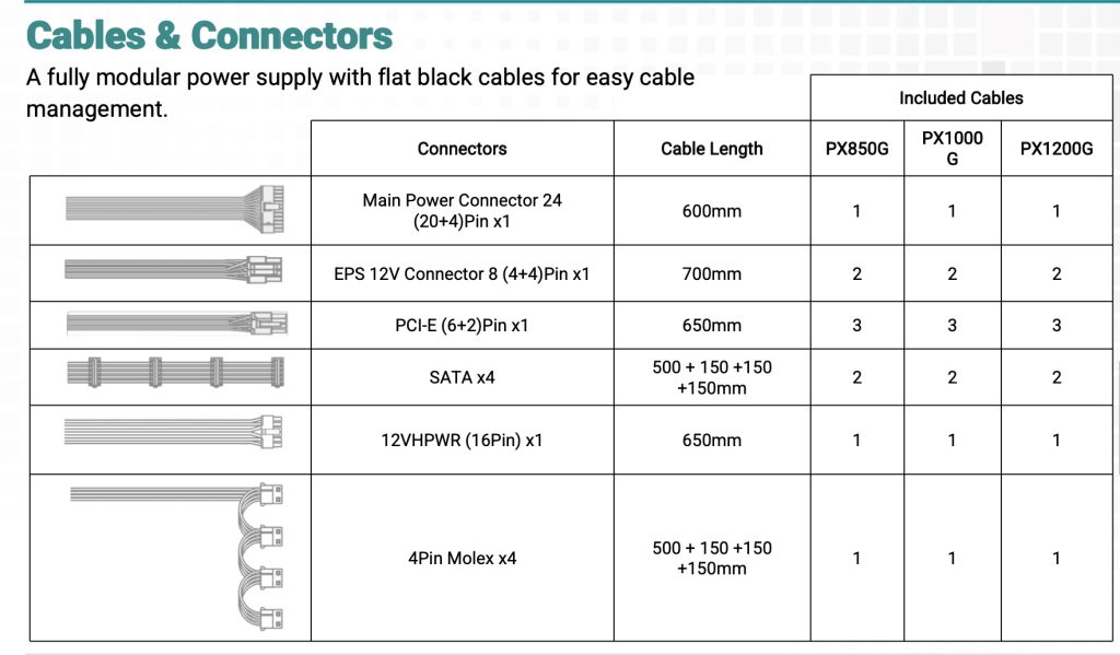 DeepCool supply the same amount of cables between the 1000W and 1200W units. There are plenty of cables to cater for all build scenarios I could imagine with the SATA cables having 150mm distance between each connector, which is fine.