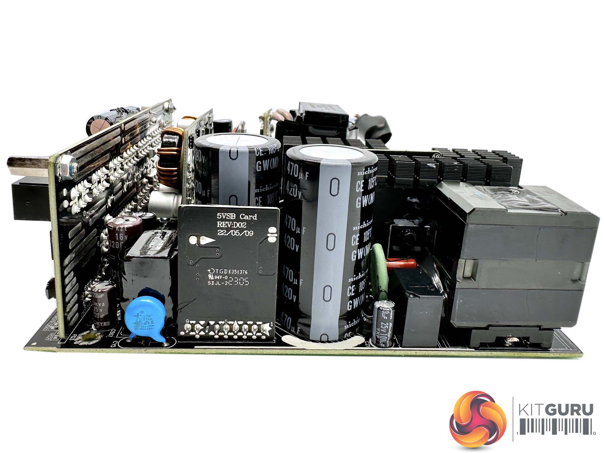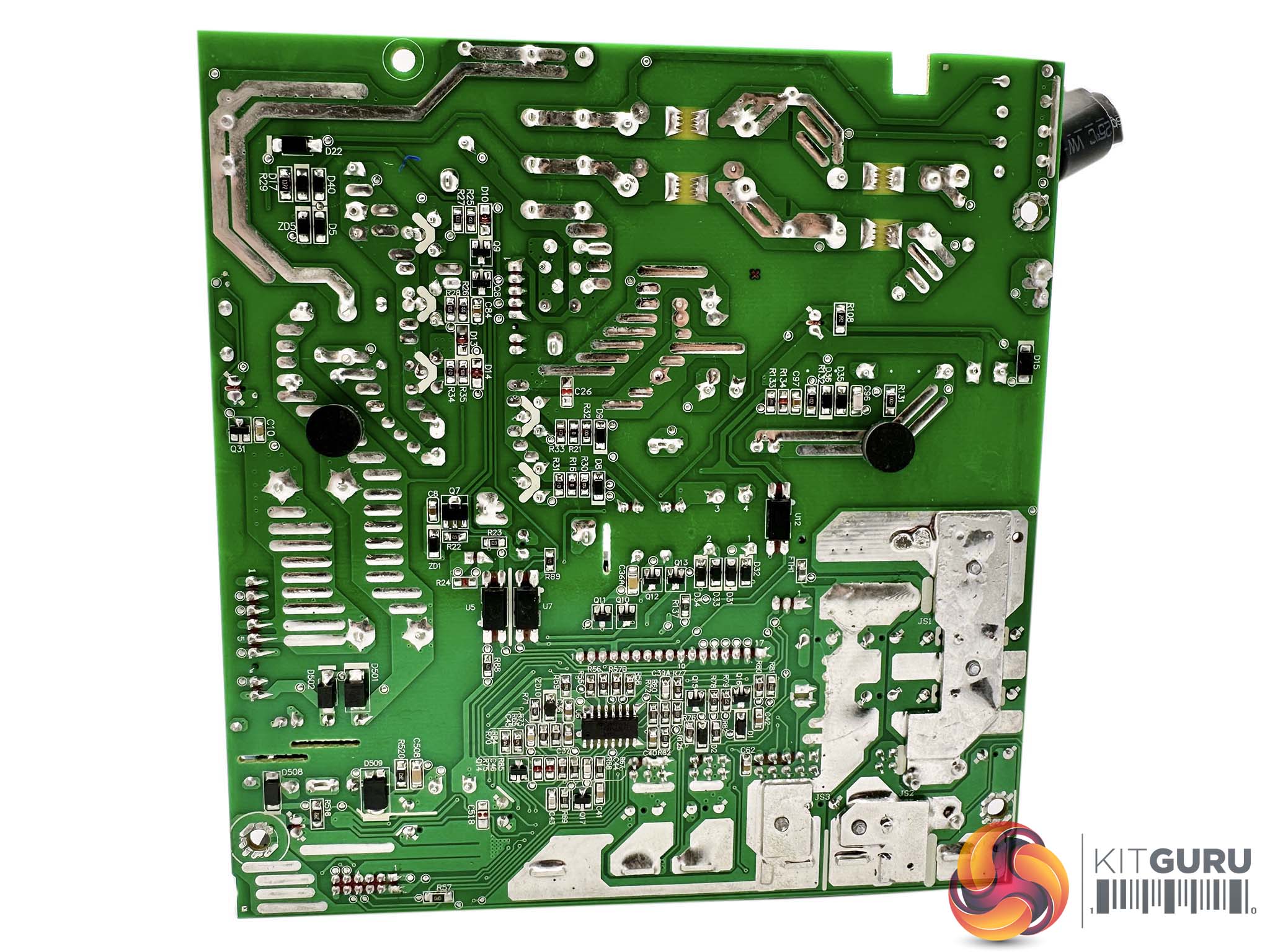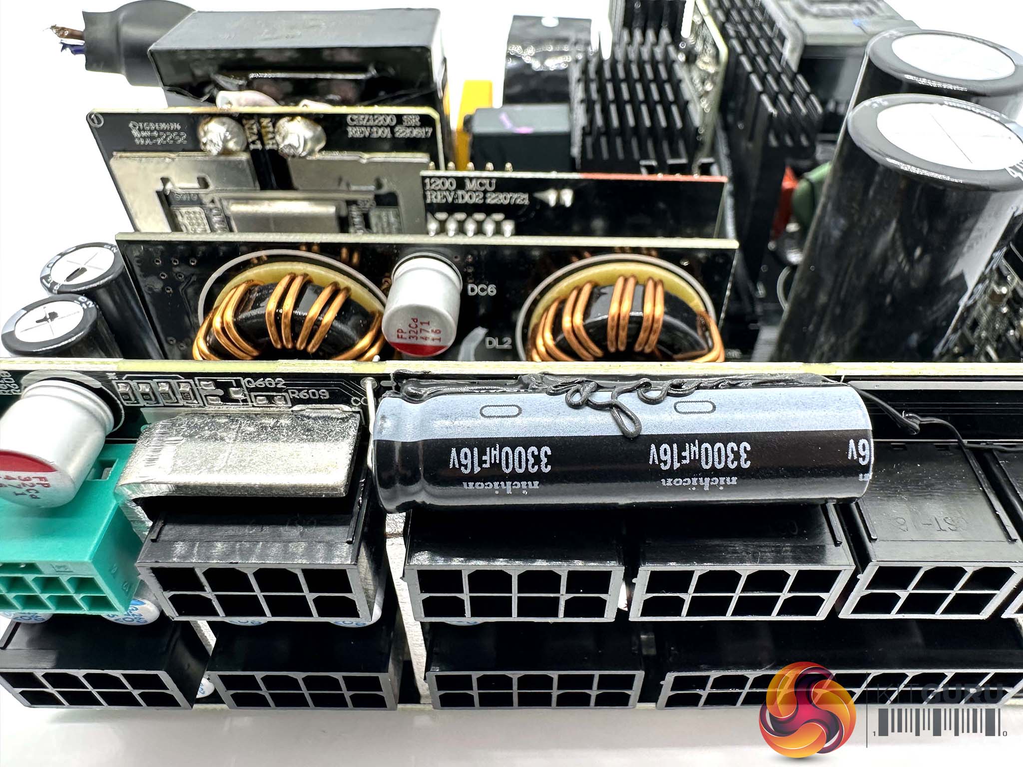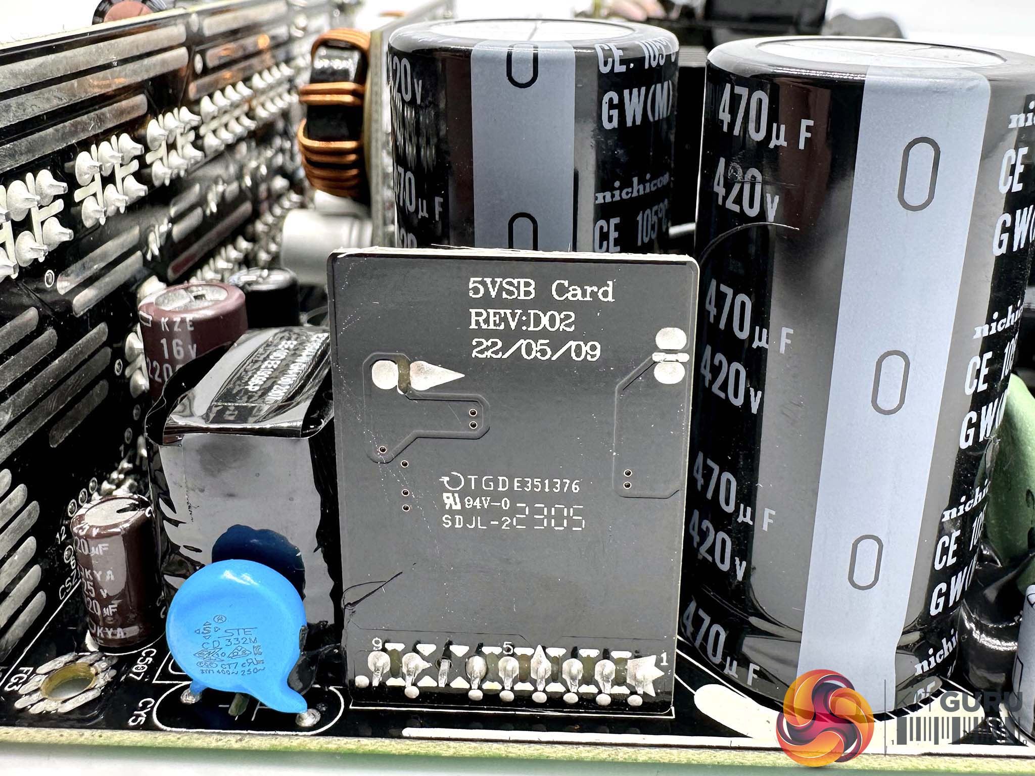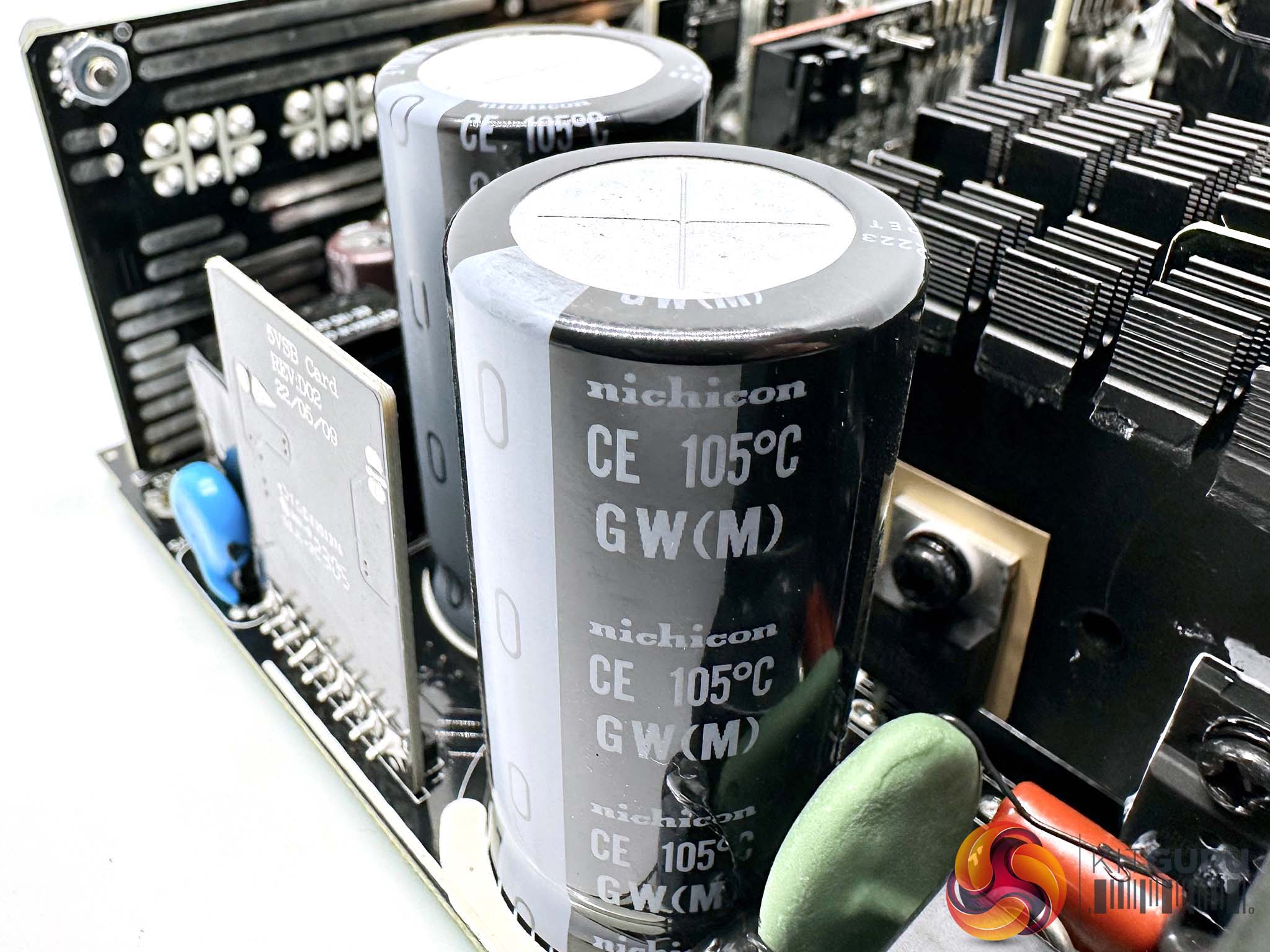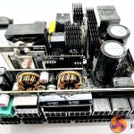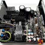 This is a CWT OEM design which has been adopted in several power supplies lately. It is a solid design. A half bridge topology and an LLC resonant converter feature on the primary side. It is reassuring to see two high grade 105c rated Japanese Nichicon capacitors on the primary side rated 470uf, 420V, for a total of 940uF. Two VRM's are used to generate the minor rails. Soldering quality on the PCB is high with some copper plates used.