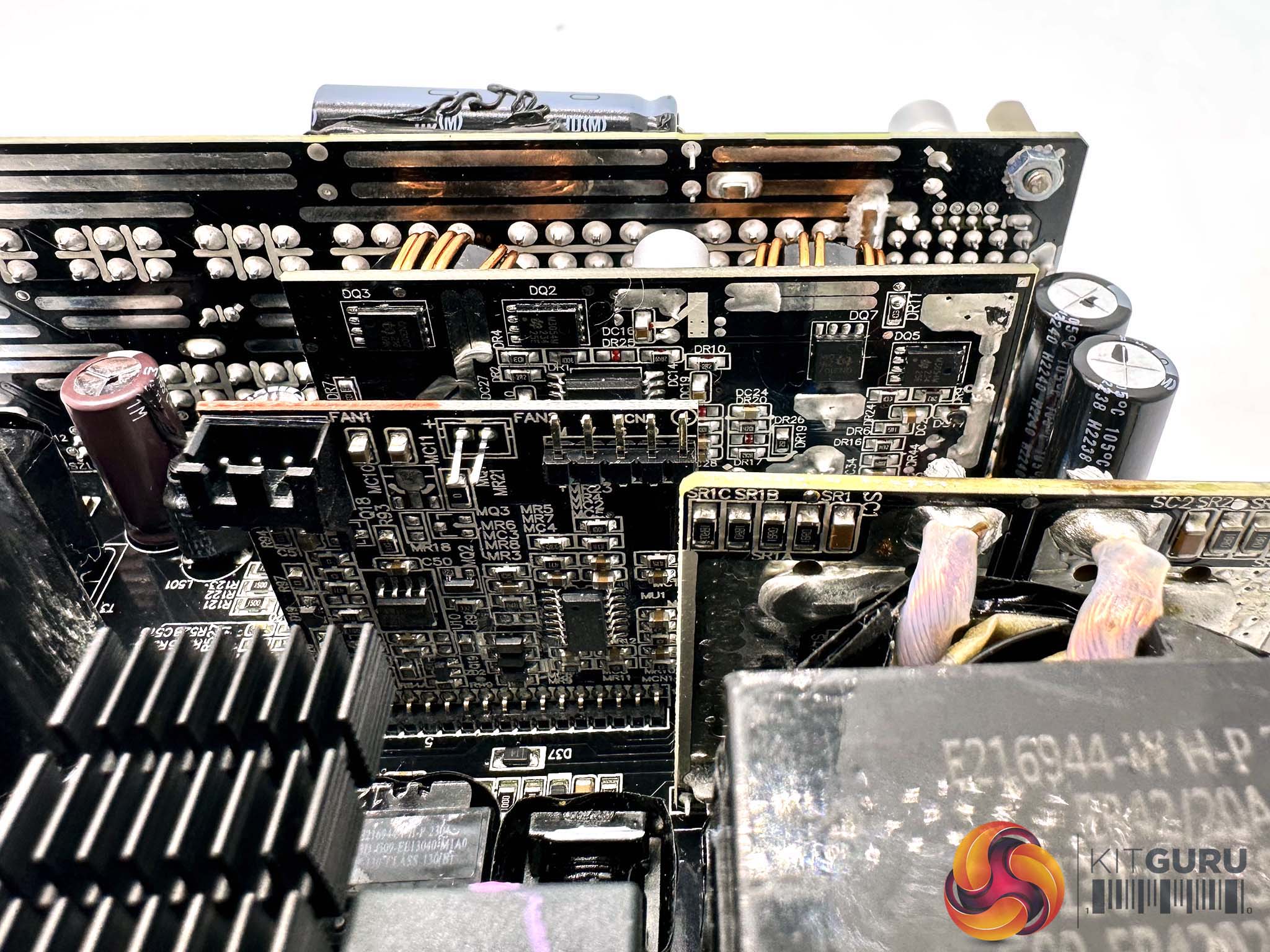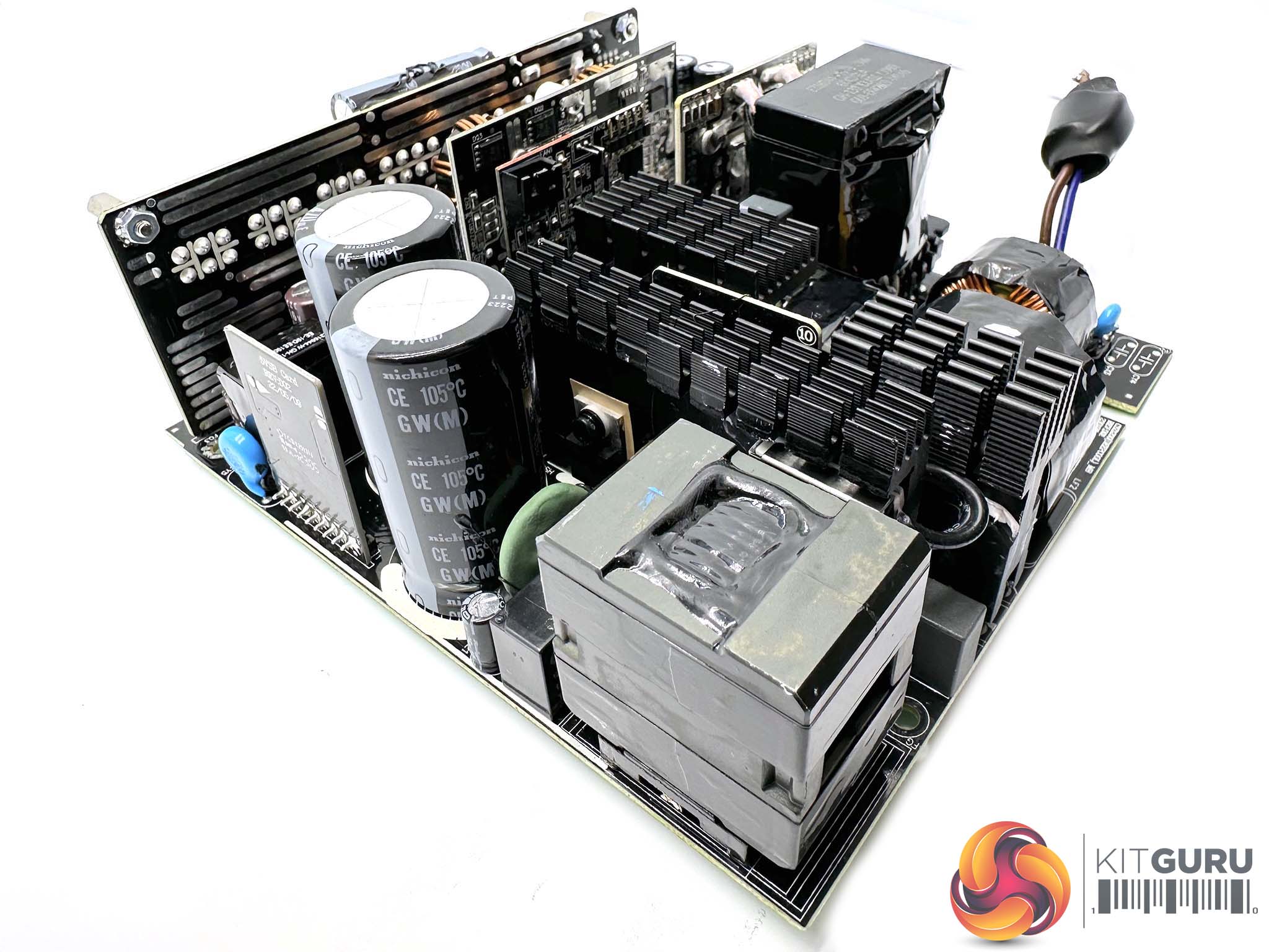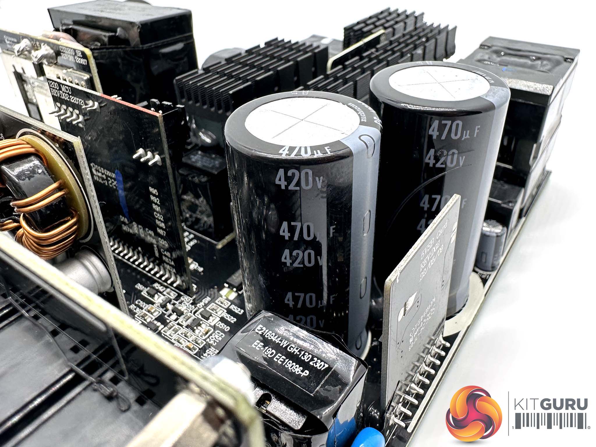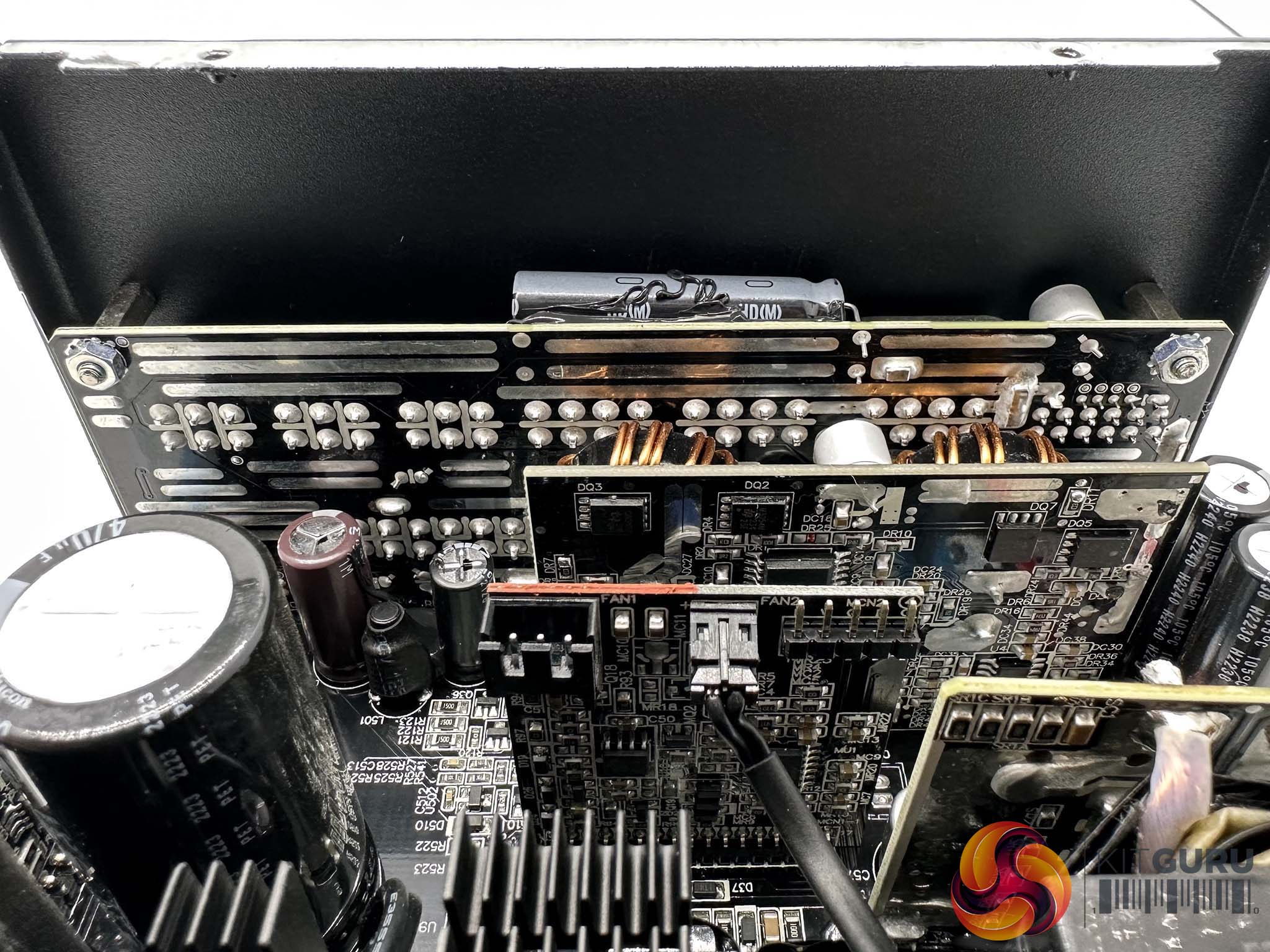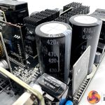 This is a CWT OEM design which has been adopted in several power supplies lately. It is a solid design. A half bridge topology and an LLC resonant converter feature on the primary side. It is reassuring to see two high grade 105c rated Japanese Nichicon capacitors on the primary side rated 470uf, 420V, for a total of 940uF. Two VRM's are used to generate the minor rails. Soldering quality on the PCB is high with some copper plates used.