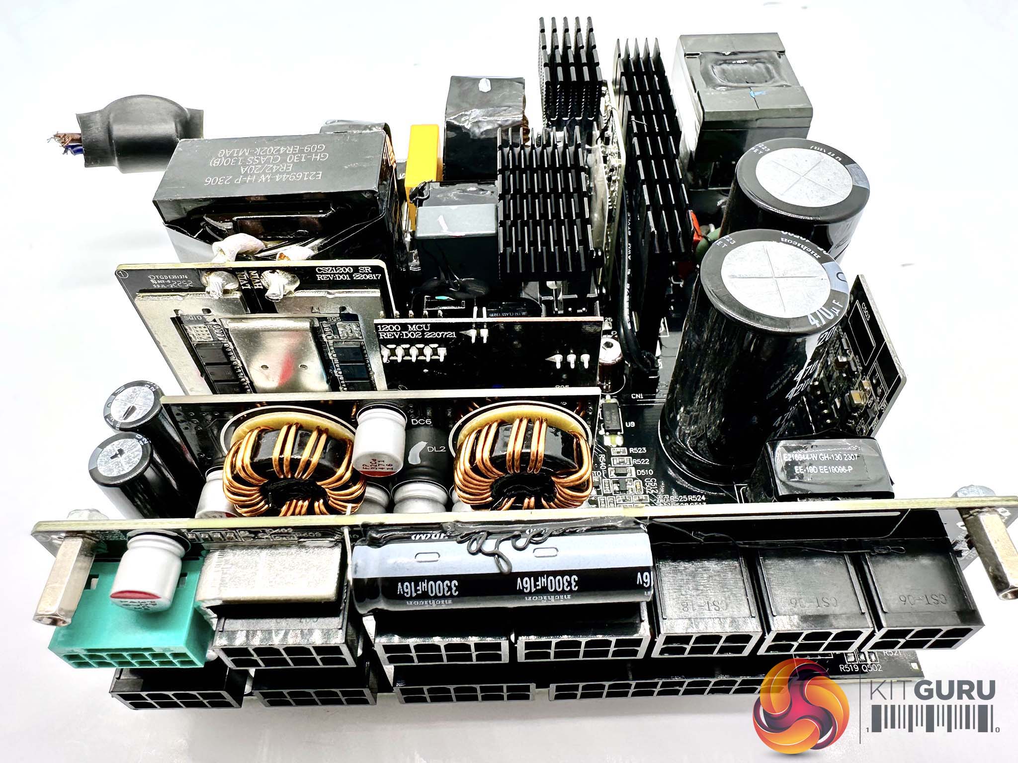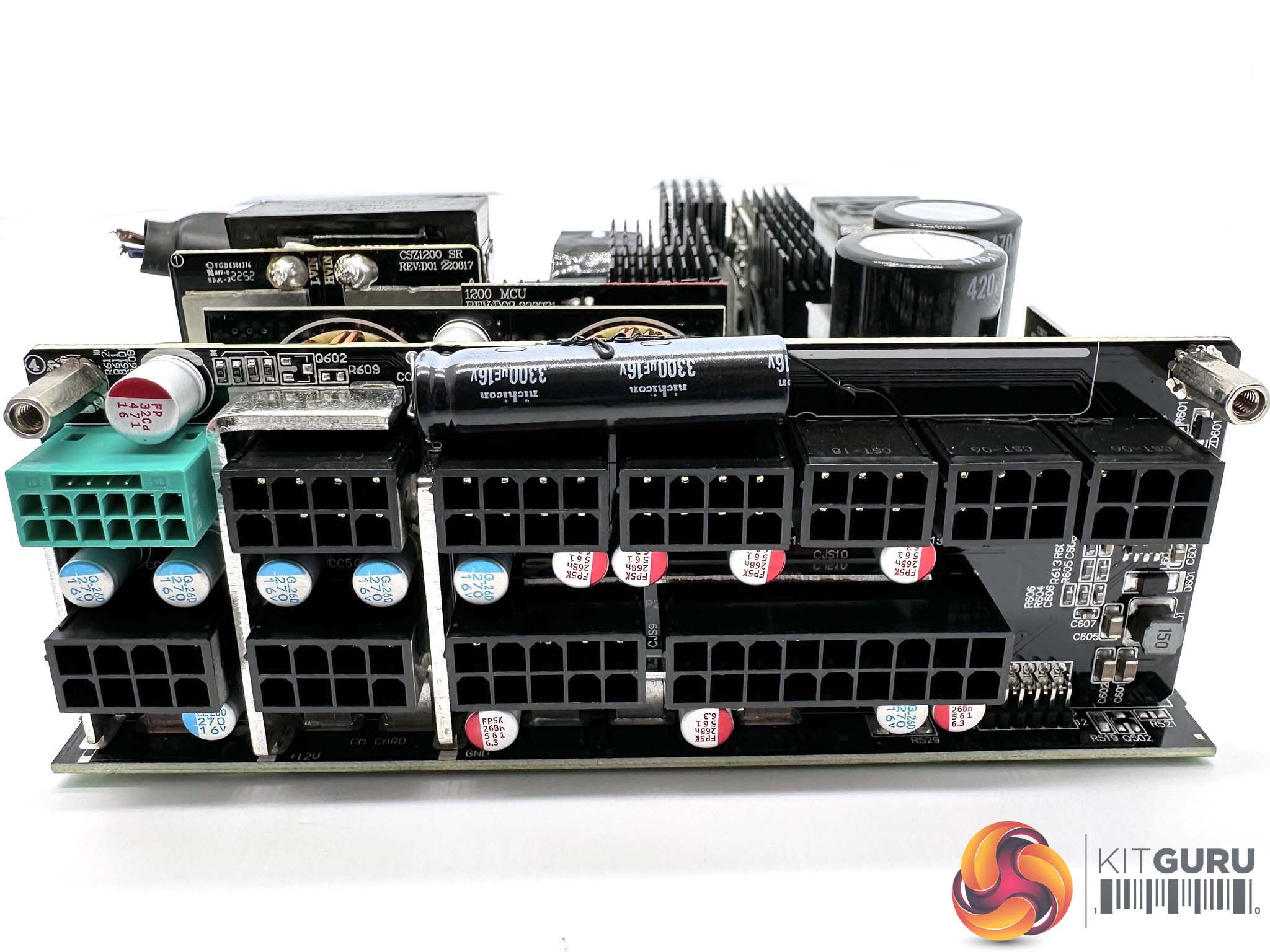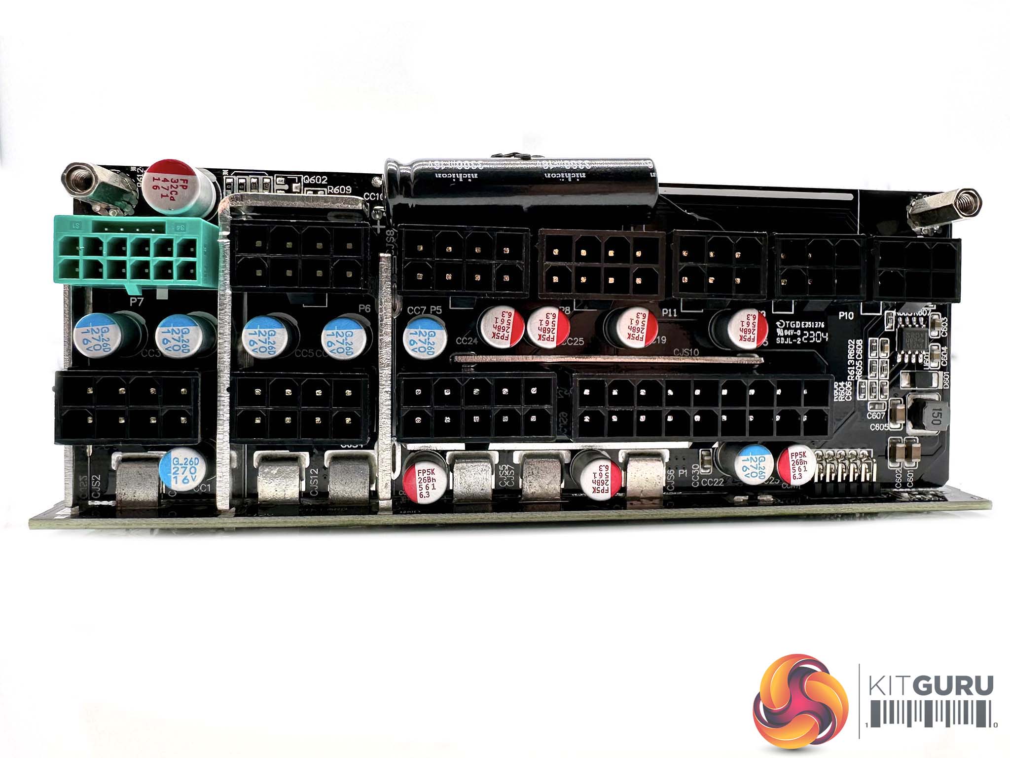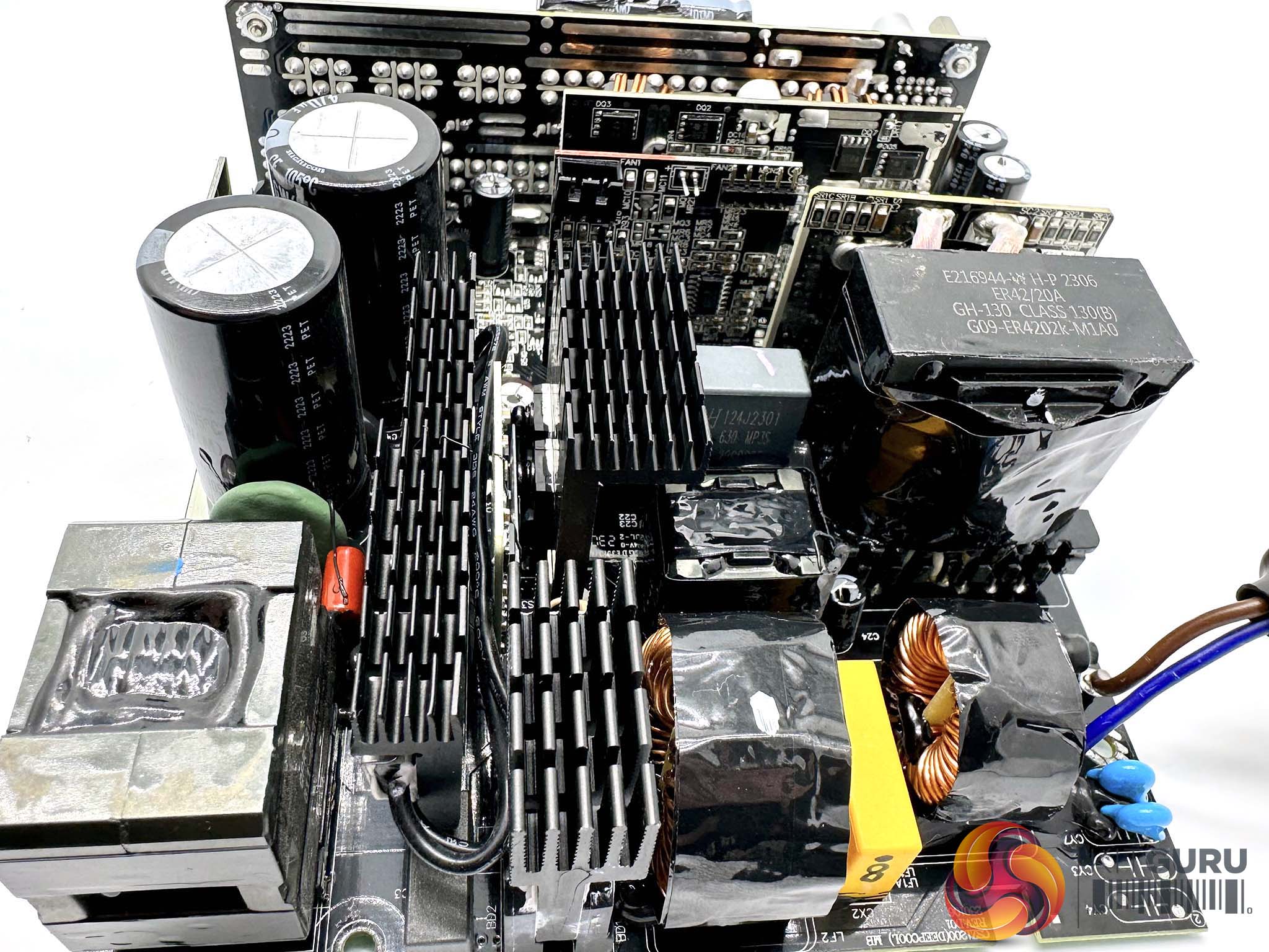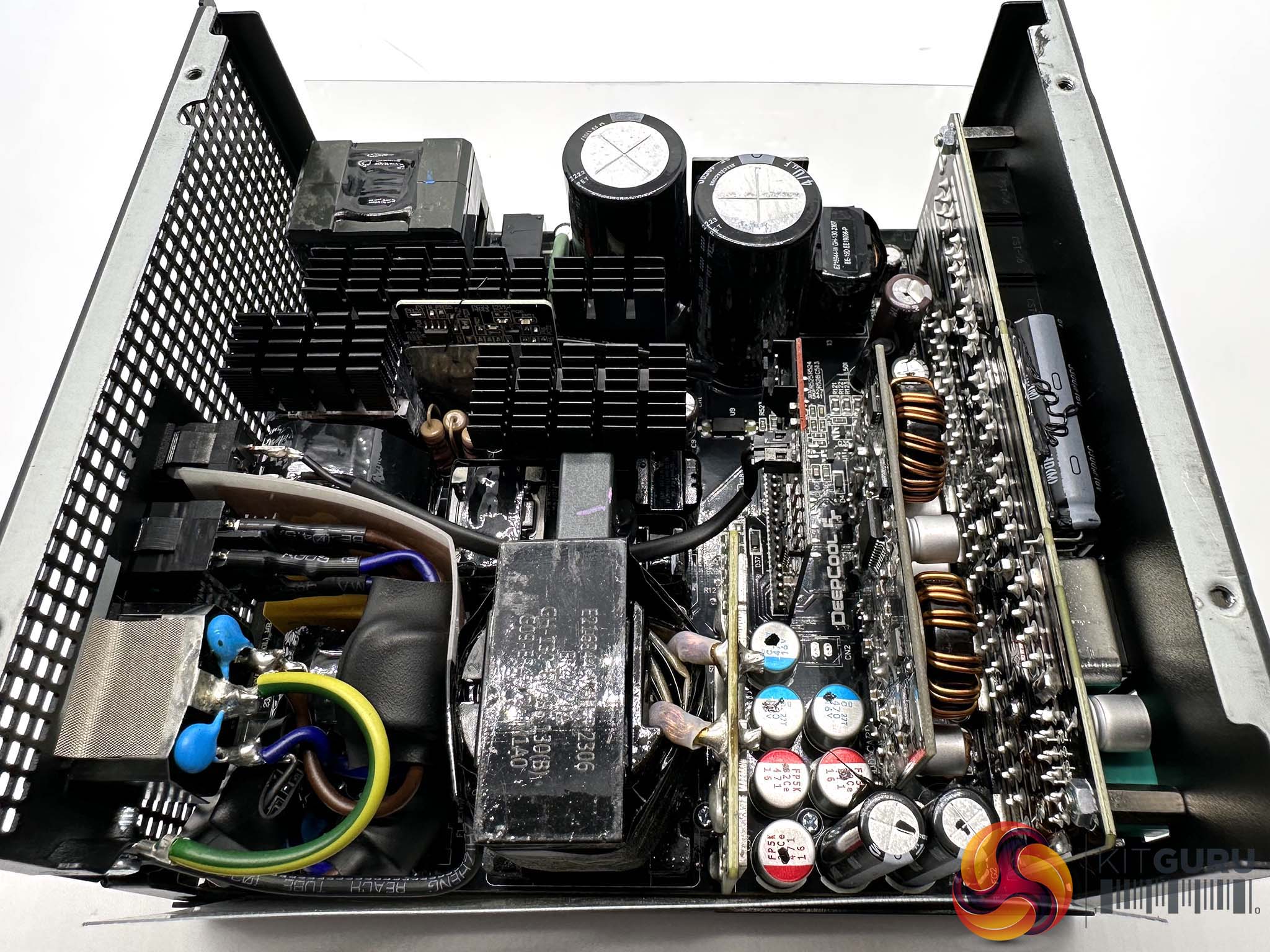 This is a CWT OEM design which has been adopted in several power supplies lately. It is a solid design. A half bridge topology and an LLC resonant converter feature on the primary side. It is reassuring to see two high grade 105c rated Japanese Nichicon capacitors on the primary side rated 470uf, 420V, for a total of 940uF. Two VRM's are used to generate the minor rails. Soldering quality on the PCB is high with some copper plates used.