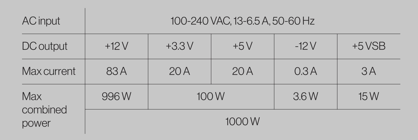 The power supply is able to deliver 83A on the +12V rail for 996 Watts of the total power. Both the +3.3V and +5V rails are able to delivery 20A for 100W of the total power.