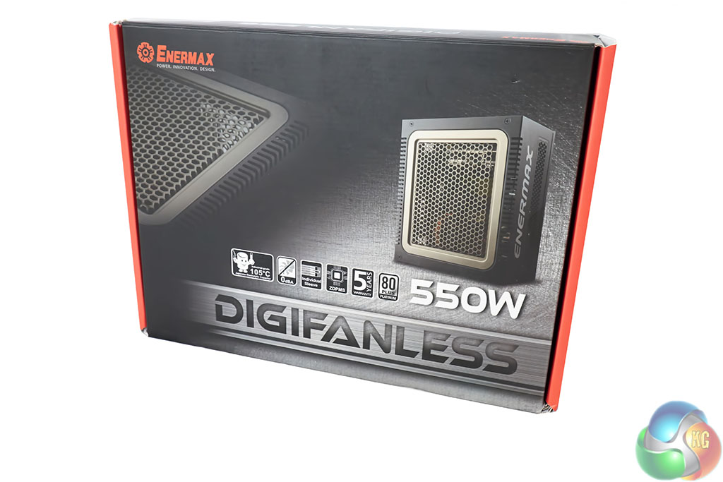 The Enermax DigiFanless 550W box is quite attractive and features a high resolution image of the powersupply, focusing on the fan less vent.