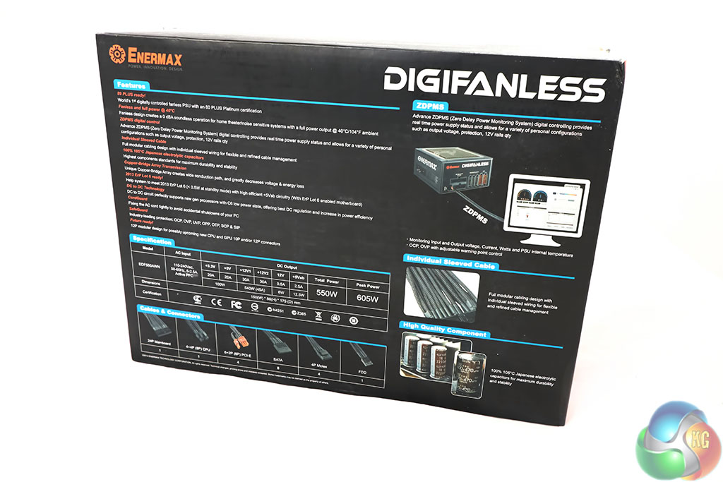The back of the box contains technical data on the power supply. Enermax are keen to point that they are using high grade Japanese capacitors. Something we always like to see.