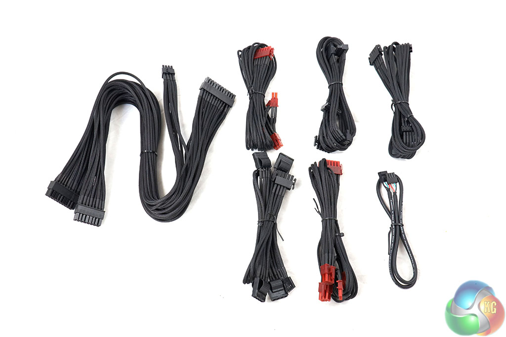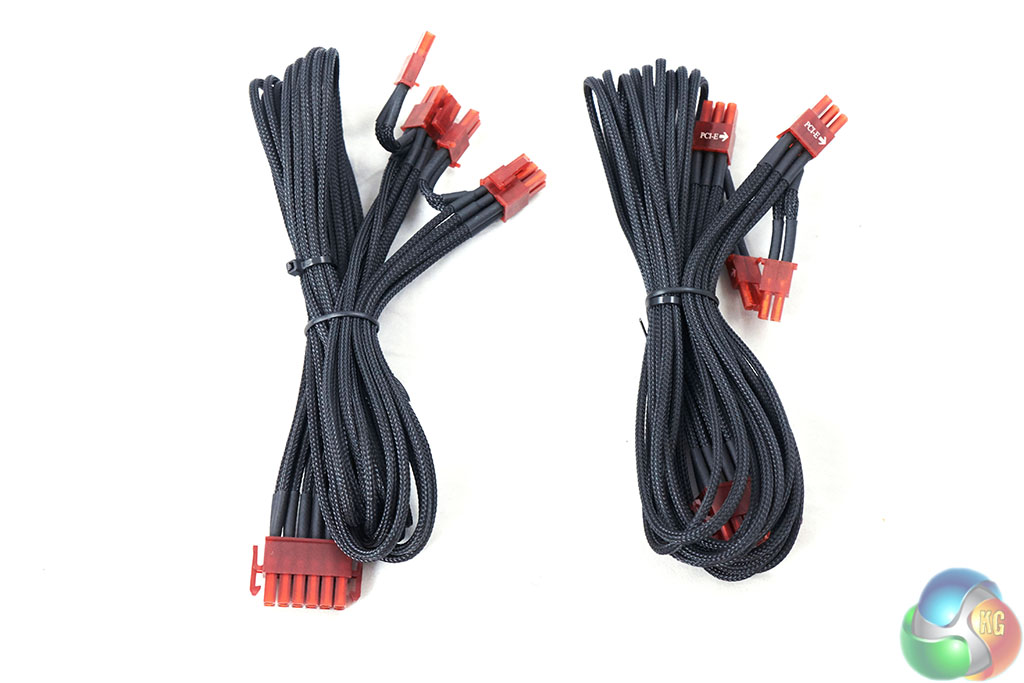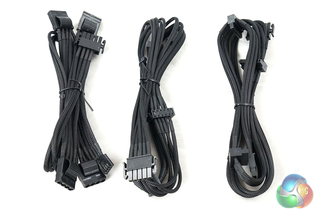 This power supply ships with two PCIe 6+2 pin cables, featuring a total of four connectors – ideal for mid range dual GPU configurations from either Nvidia or AMD. They include 8 SATA connectors for hard drives and devices. The quality of the sleeving on the cables is excellent and a huge step up over many other designs we have seen in recent months. Hard core modders will sleeve their own cables, but for the rest of us, this is a welcome addition.