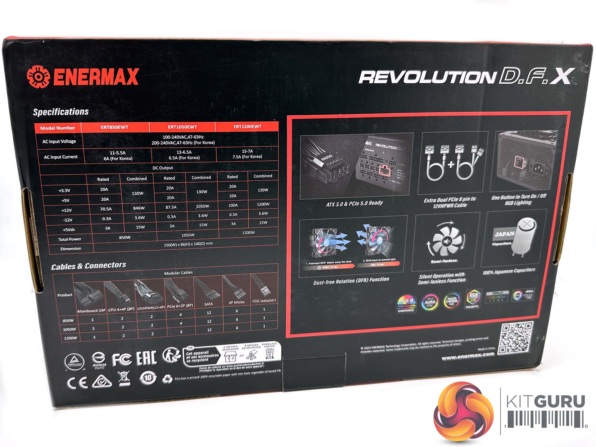 The Enermax box is colourful with some key points listed along the top right corner – including ATX 3.0 Ready, PCIe 5.0 Ready, and 80 Plus Gold certification – alongside the use of Japanese capacitors.