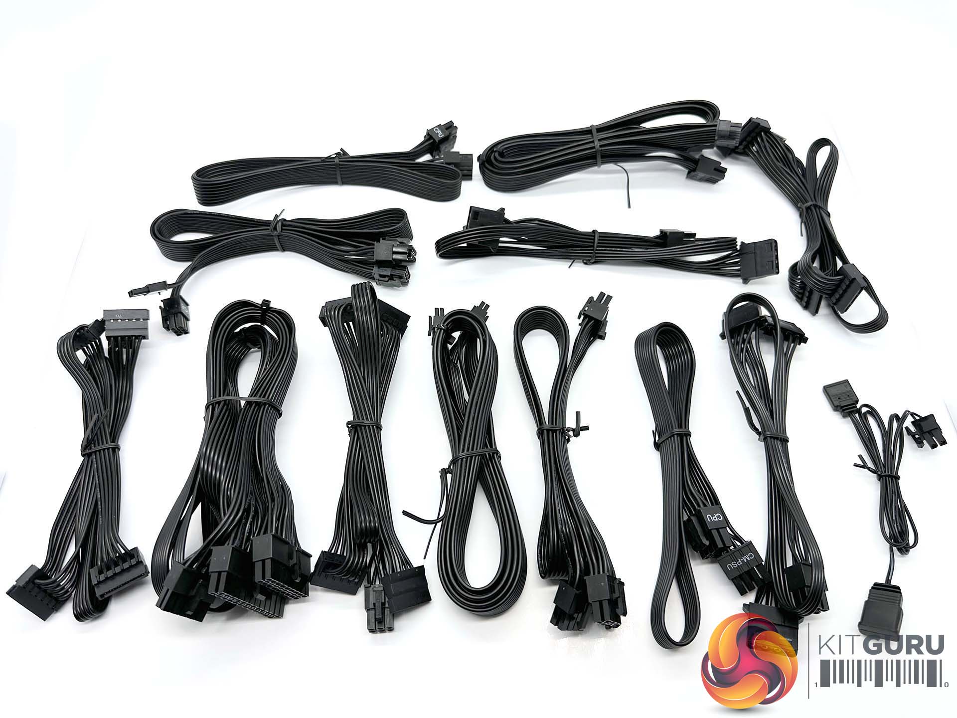The cables are all sleeved for ease of routing during the build phase. The motherboard cable is 65cm long. The CPU 4+4 connectors are 60cm and 70cm respectively. The 12VHPWR 12+4 pin cable is 60cm long. The PCIe 6+2 pin cable is 2×65/15cm. The 2xPCIe 8 pin – 12VHPWR splitter cable is 60cm. The 12x SATA cables are 4×45/15/15/15cm. The 4P Molex cables are 2×50/15/15cm. The extra dual PCIe 8-pin to 12VHPWR cable may come in useful.