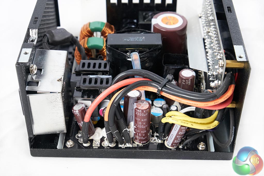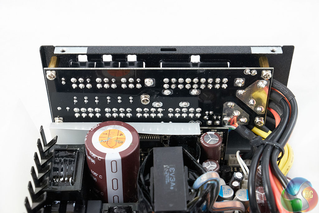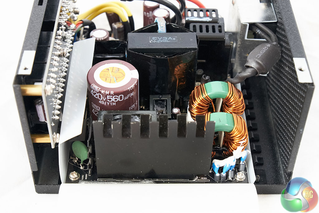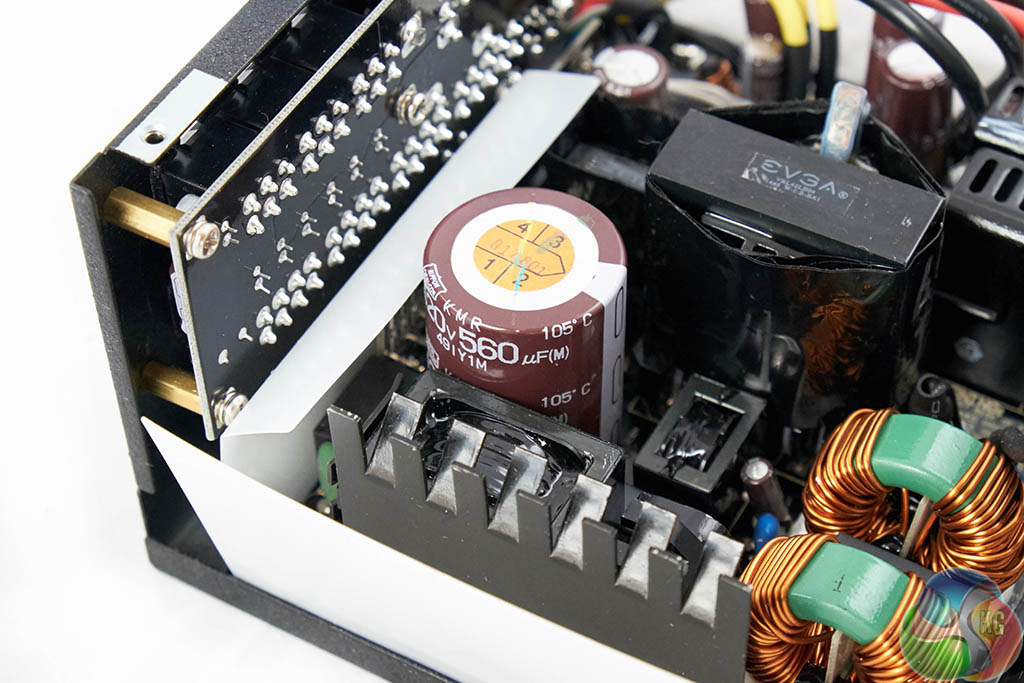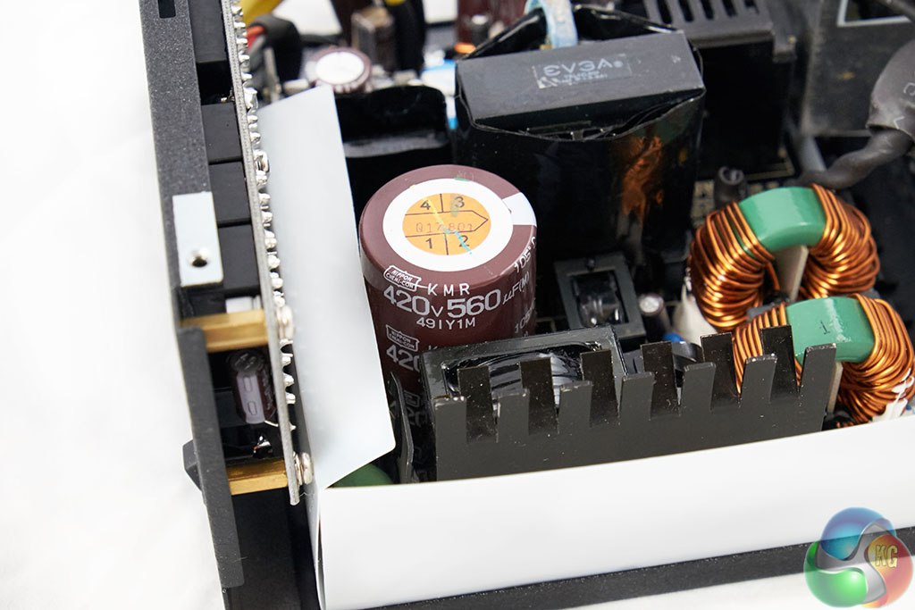 We are pleased to see that this Seasonic design utilises all Japanese capacitors, on both primary and secondary stages. The primary stage capacitor is 105c rated, from the Nippon Chemi Con KMR series – rated 420V 560uF. Top marks.