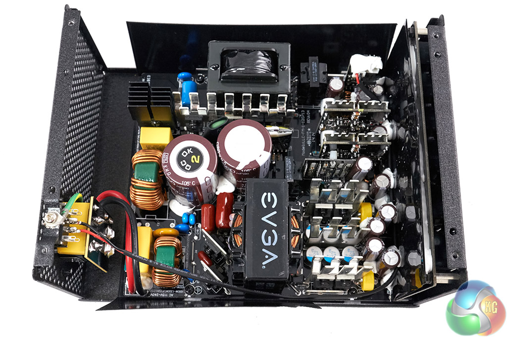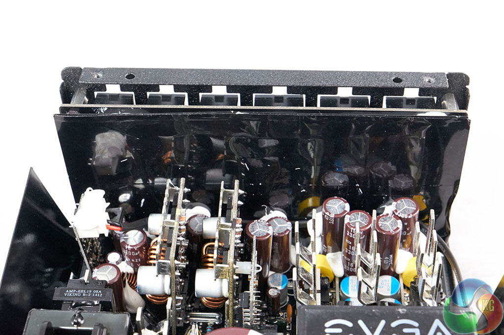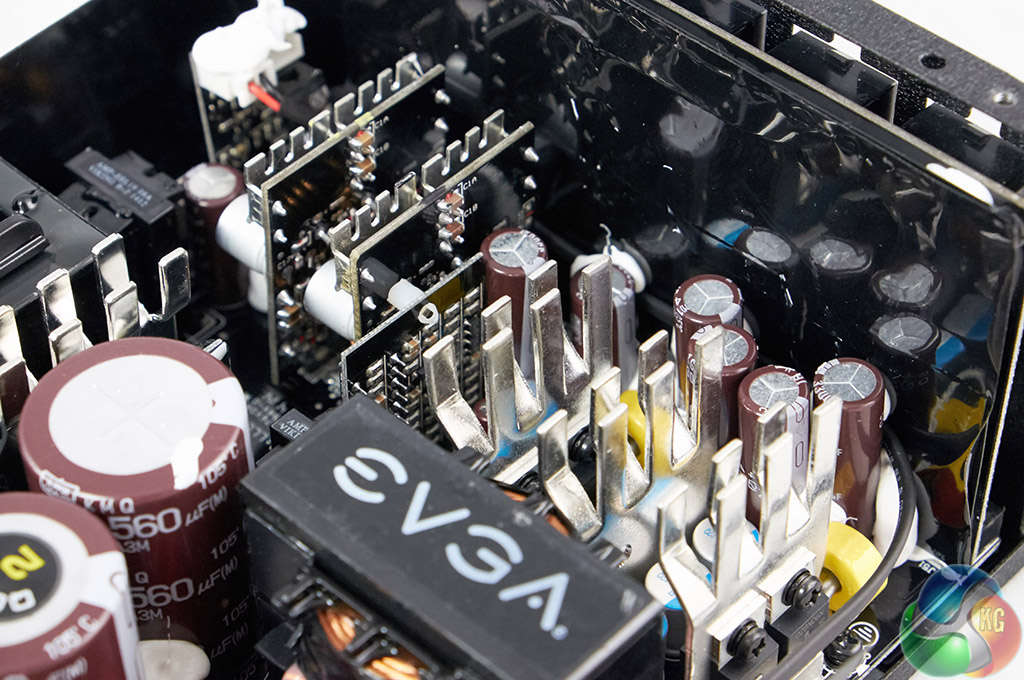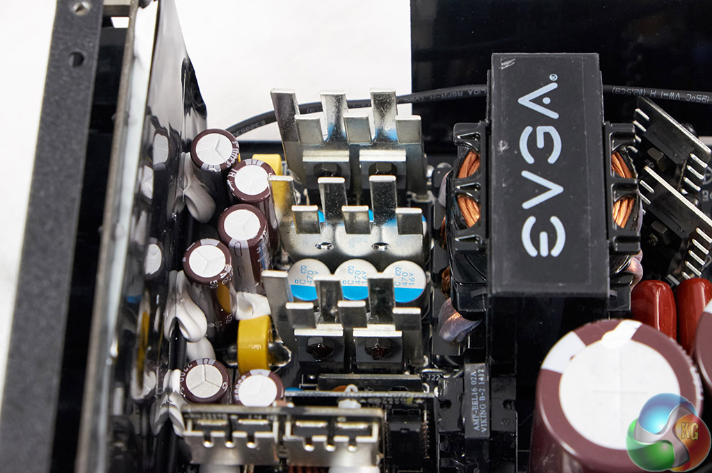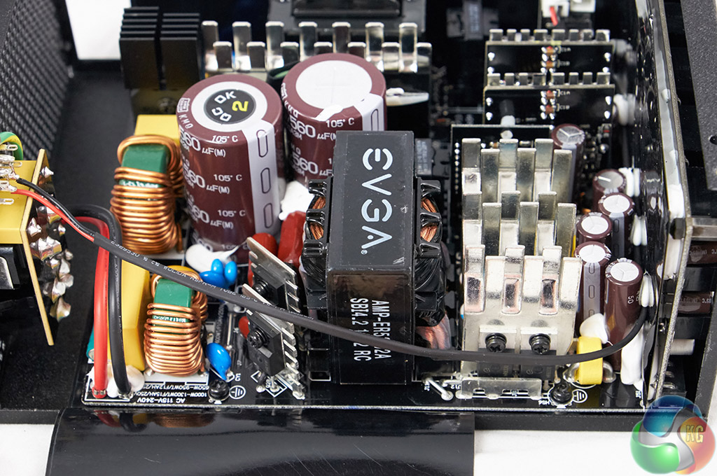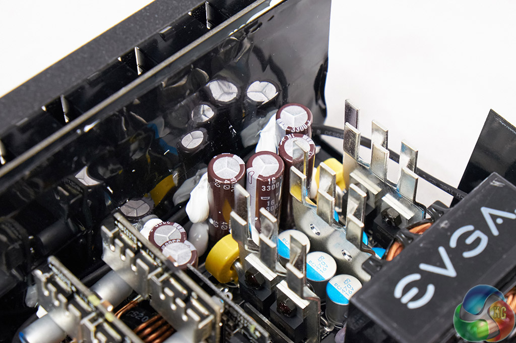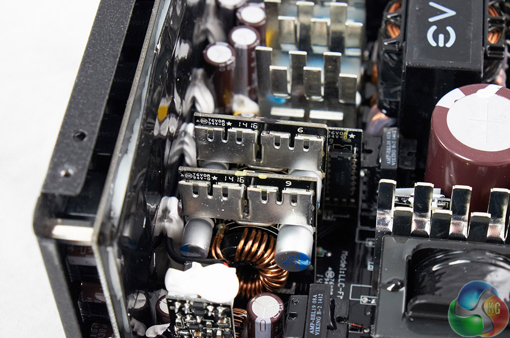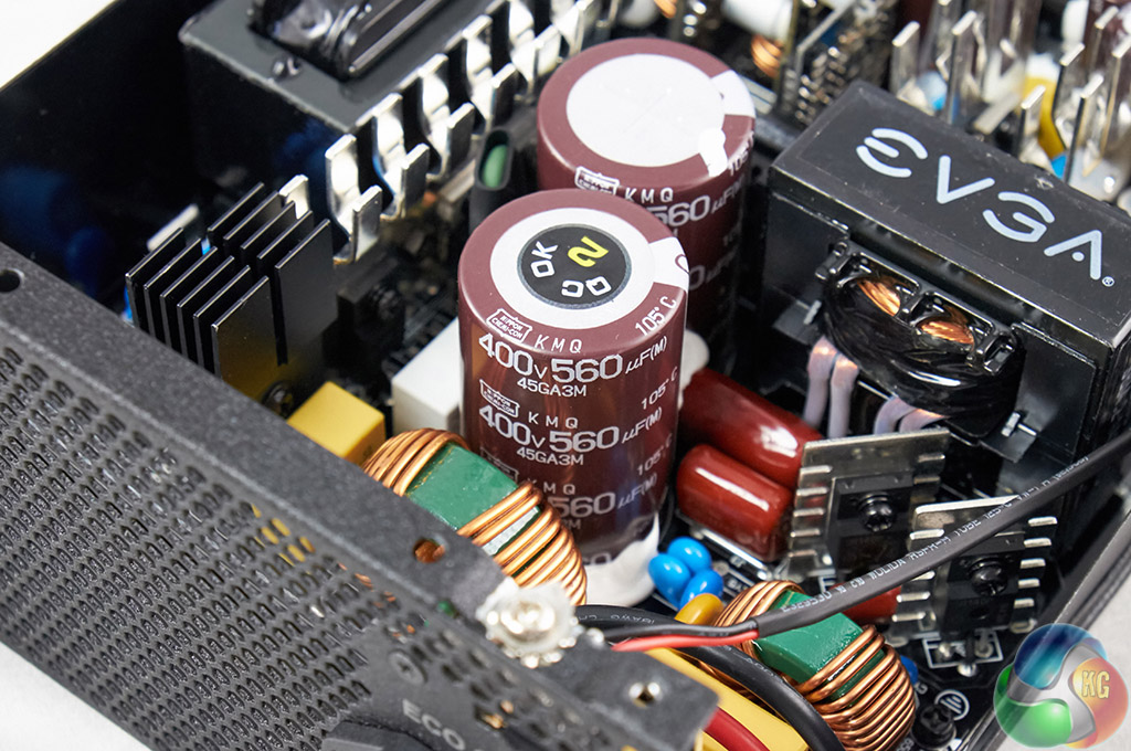 The primary stage uses a pair of high grade 105C rated Japanese Nippon Chemi-Con capacitors. (KMQ series) These are rated 400V, 560uF – combining for a total of 1120uF. Secondary stage capacitors are all Japanese (Nippon Chemi-Con) and rated 105C. Top marks to Super Flower for not compromising here.
