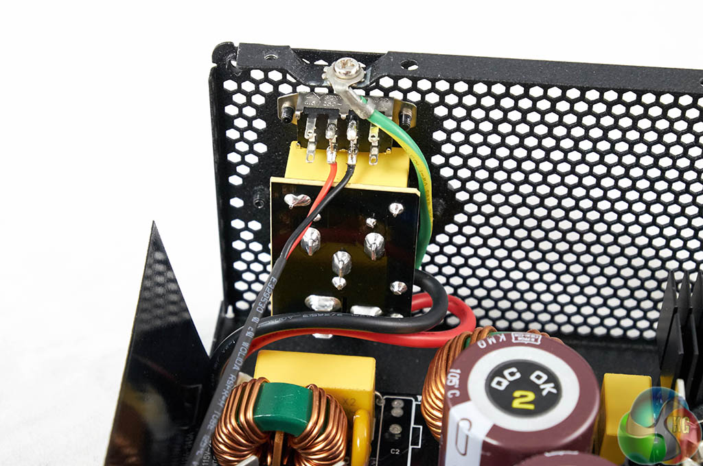 Transient filtering starts at the AC Receptacle which consists initially of a single X cap. The main PCB houses the second stage and features two CM chokes, two pairs of Y caps, two X caps and an MOV. Super Flower have built in a Transient Voltage Suppression diode to help protect against spiking.