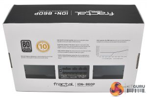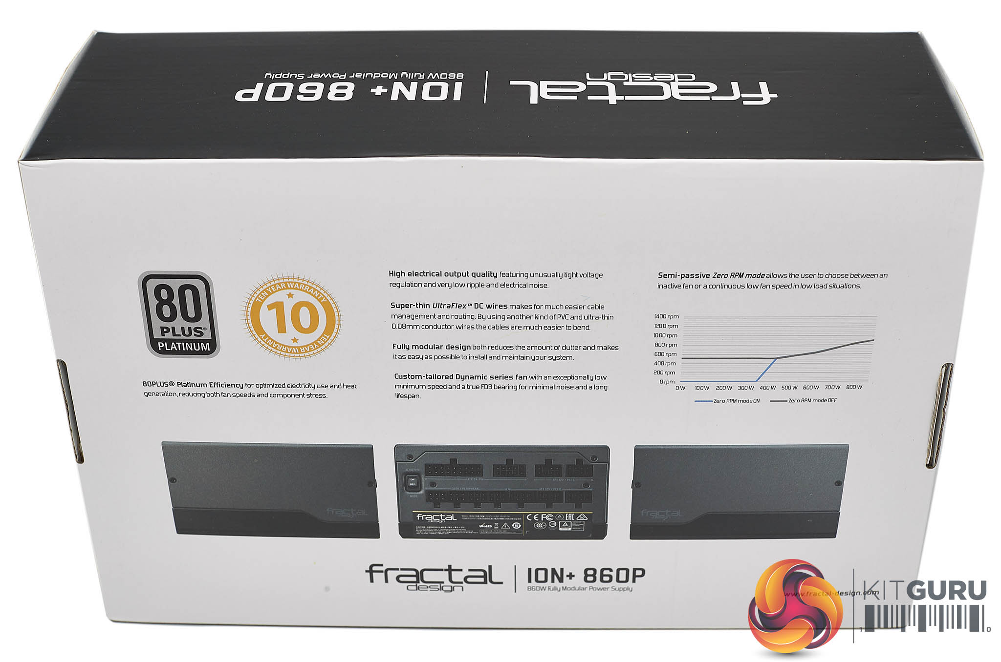 The rear of the box highlights the 80 Plus Platinum efficiency, the 10 year warranty and the semi passive zero fan mode alongside some photographs, including one that highlights the full modular bay.