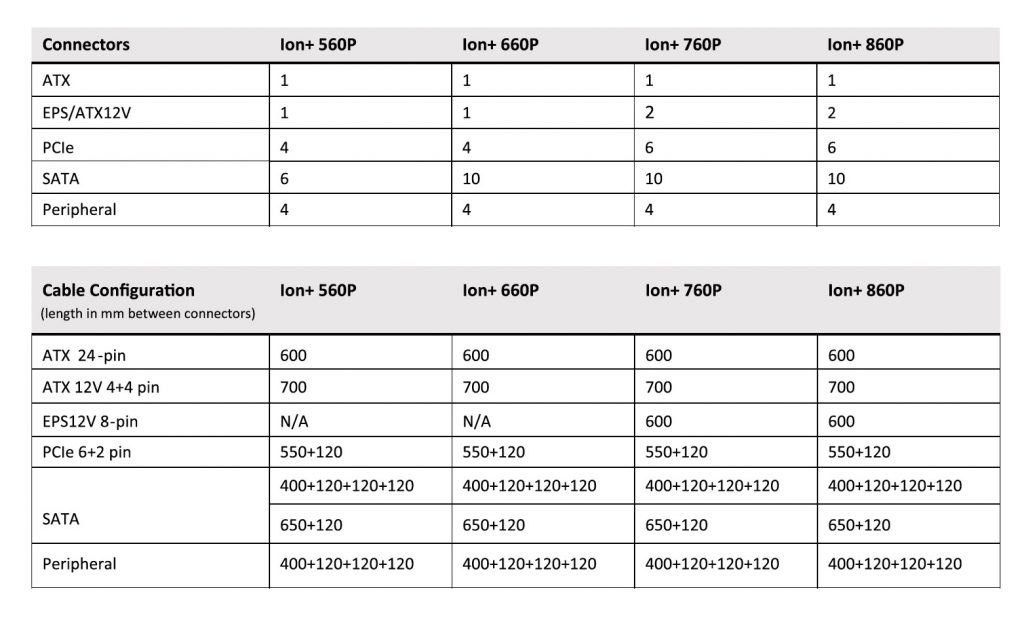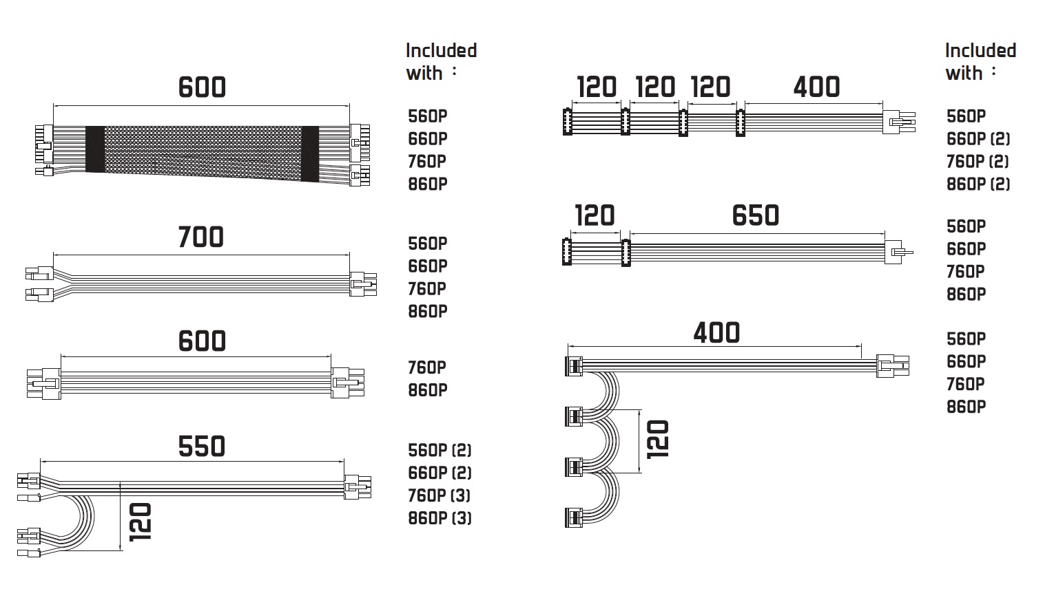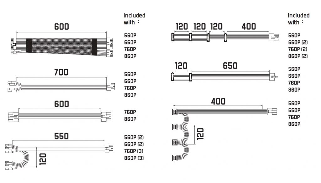 The larger 760P and 860P ship with 6 PCIe, and 10 SATA connectors. The higher powered models also incorporate an extra EPS/ATX12V connector for more CPU demanding systems such as AMD's Threadripper. Fractal are using an extra long 600mm 24 pin ATX cable and a 700mm 4+4 pin cable.