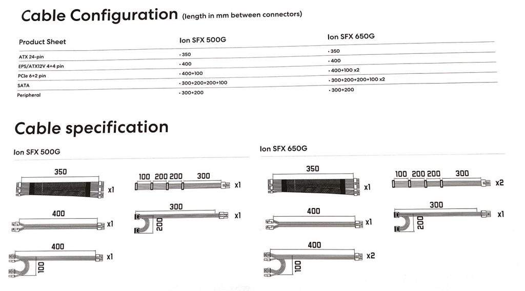 The ION SFX 650G (650W model) ships with an extra PCIe 6+2 pin cable and an extra SATA cable.
