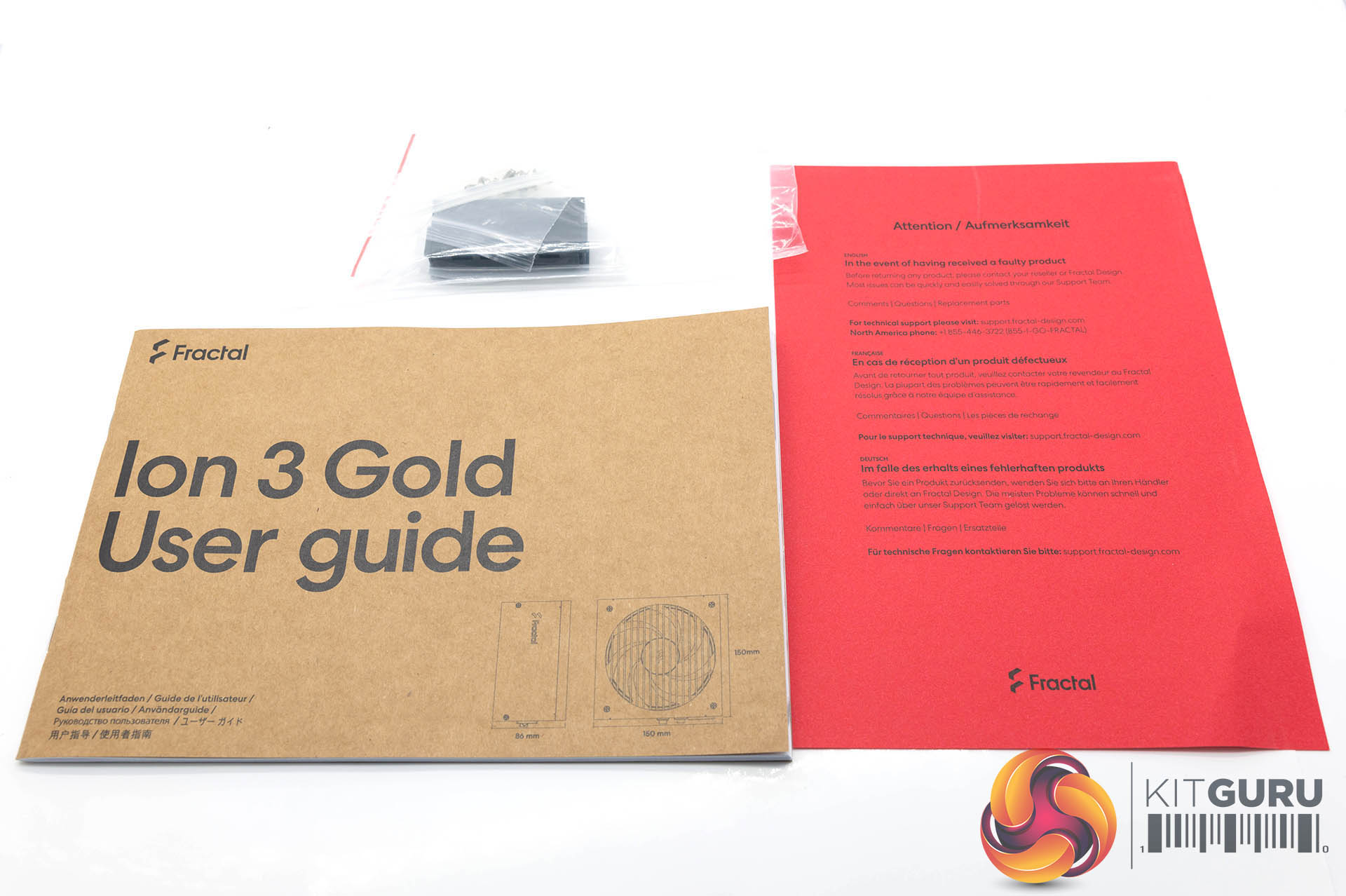 The power supply is protected between two cardboard slabs and a little felt bag around the outer case. Fractal include some white cable ties, mounting screws, literature and a tester.