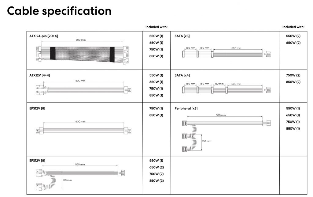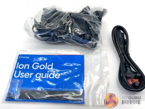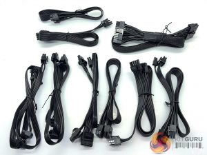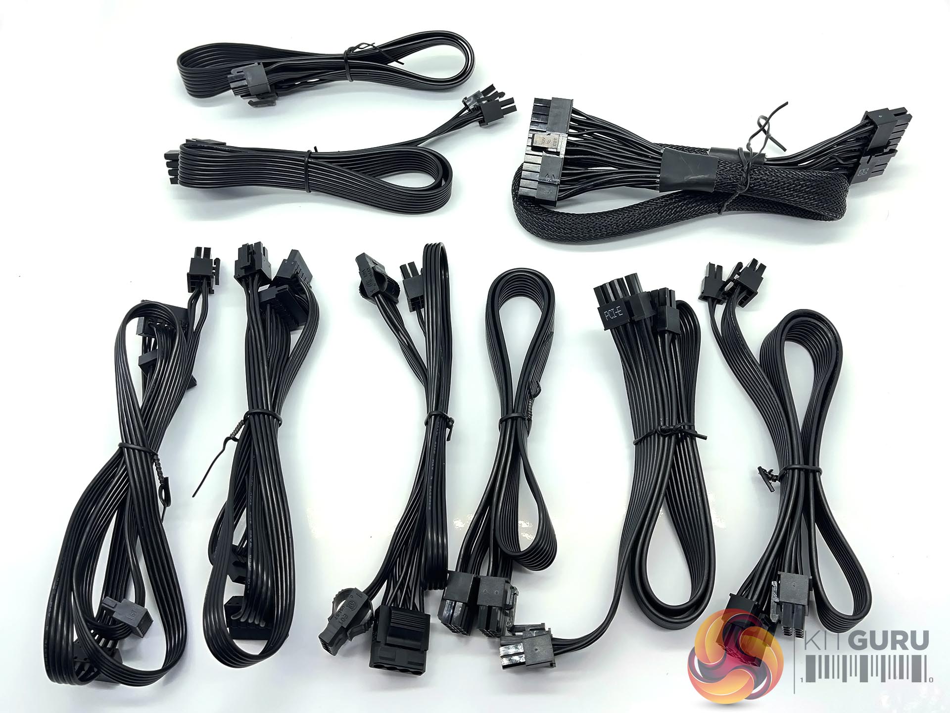 The bundle includes a user manual, 4 felt cable ties, a regional specific power cable, and a bag of modular cables. All of these are thin ribbon cables except the main ATX connector cable which is sleeved.