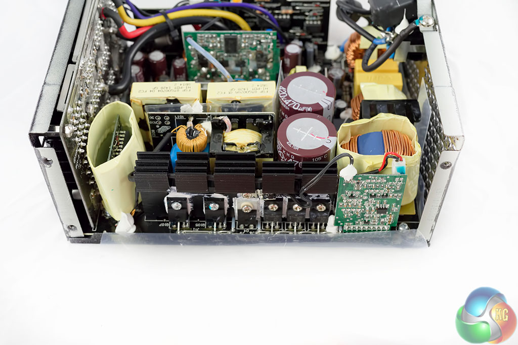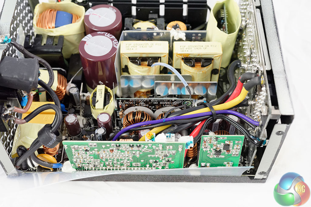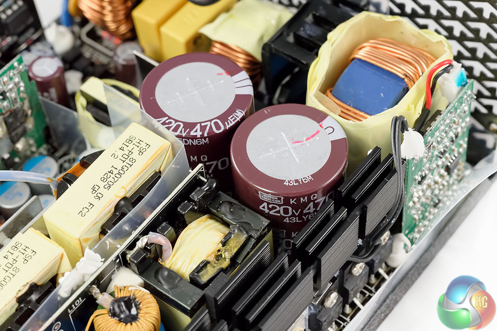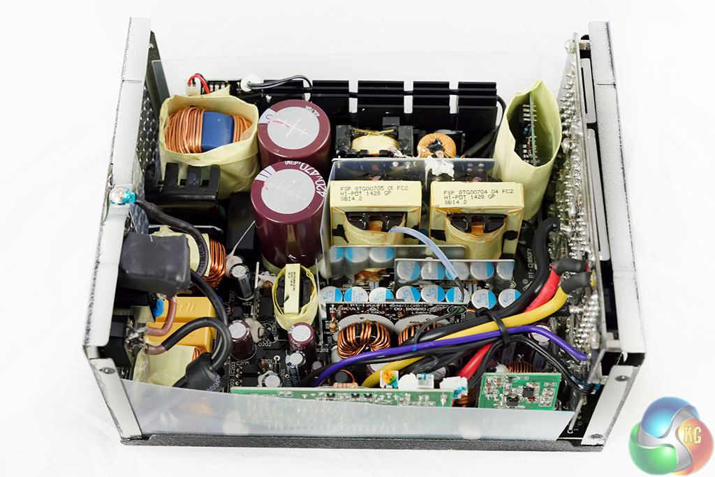 FSP are using two high grade Japanese capacitors by Nippon Chemi Con in the power supply. They are 105c rated, KMQ series. These are rated 420V, 470uF each for a total of 940uF. Their combined capacity looks a little overspecified for a 1kW PSU. Secondary capacitors are all Japanese grade, from Nippon Chemi Con and Rubycon. Bonus points to FSP for the attention to detail.