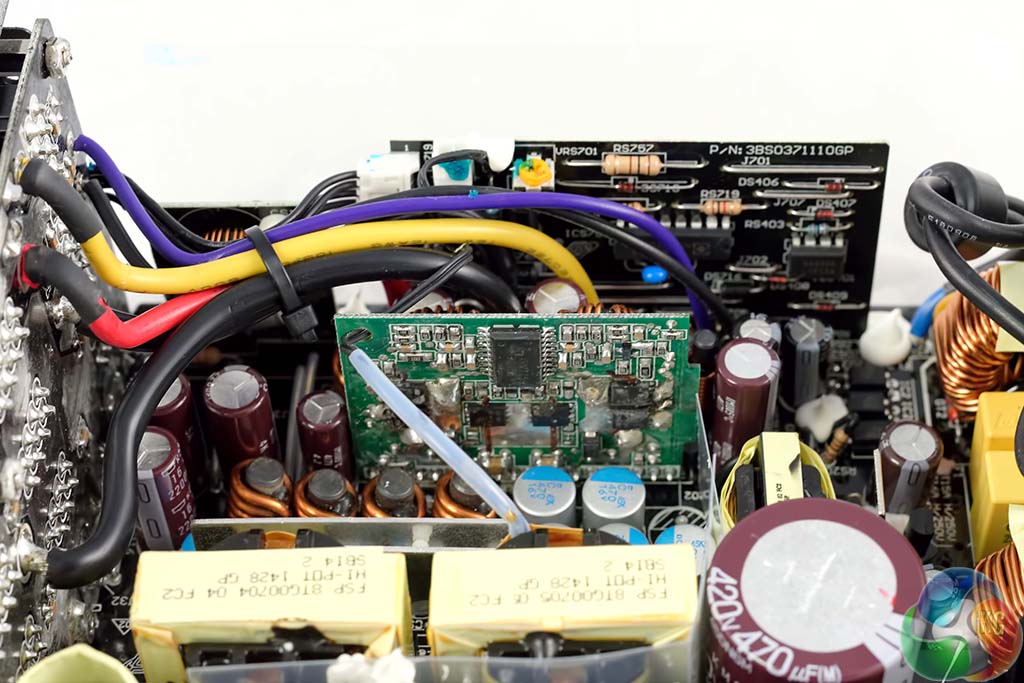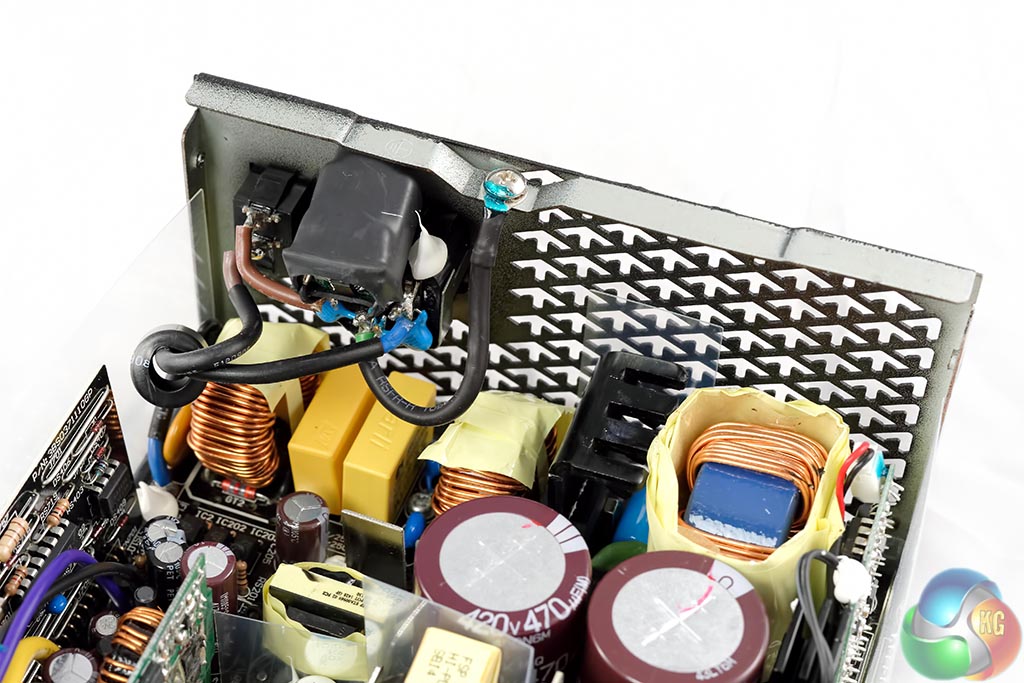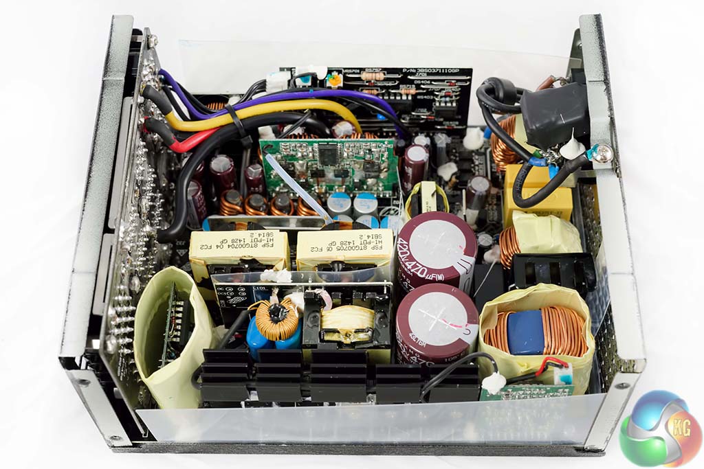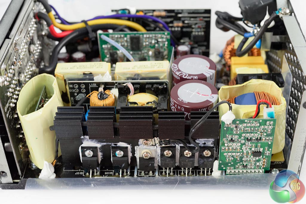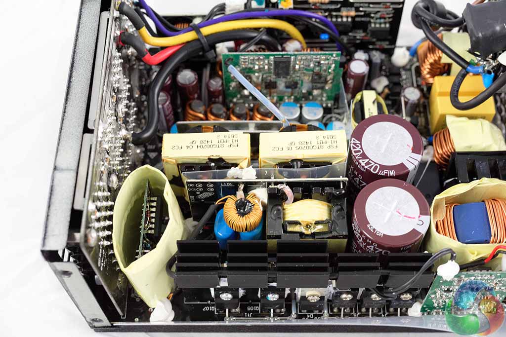 FSP are using two high grade Japanese capacitors by Nippon Chemi Con in the power supply. They are 105c rated, KMQ series. These are rated 420V, 470uF each for a total of 940uF. Their combined capacity looks a little overspecified for a 1kW PSU. Secondary capacitors are all Japanese grade, from Nippon Chemi Con and Rubycon. Bonus points to FSP for the attention to detail.