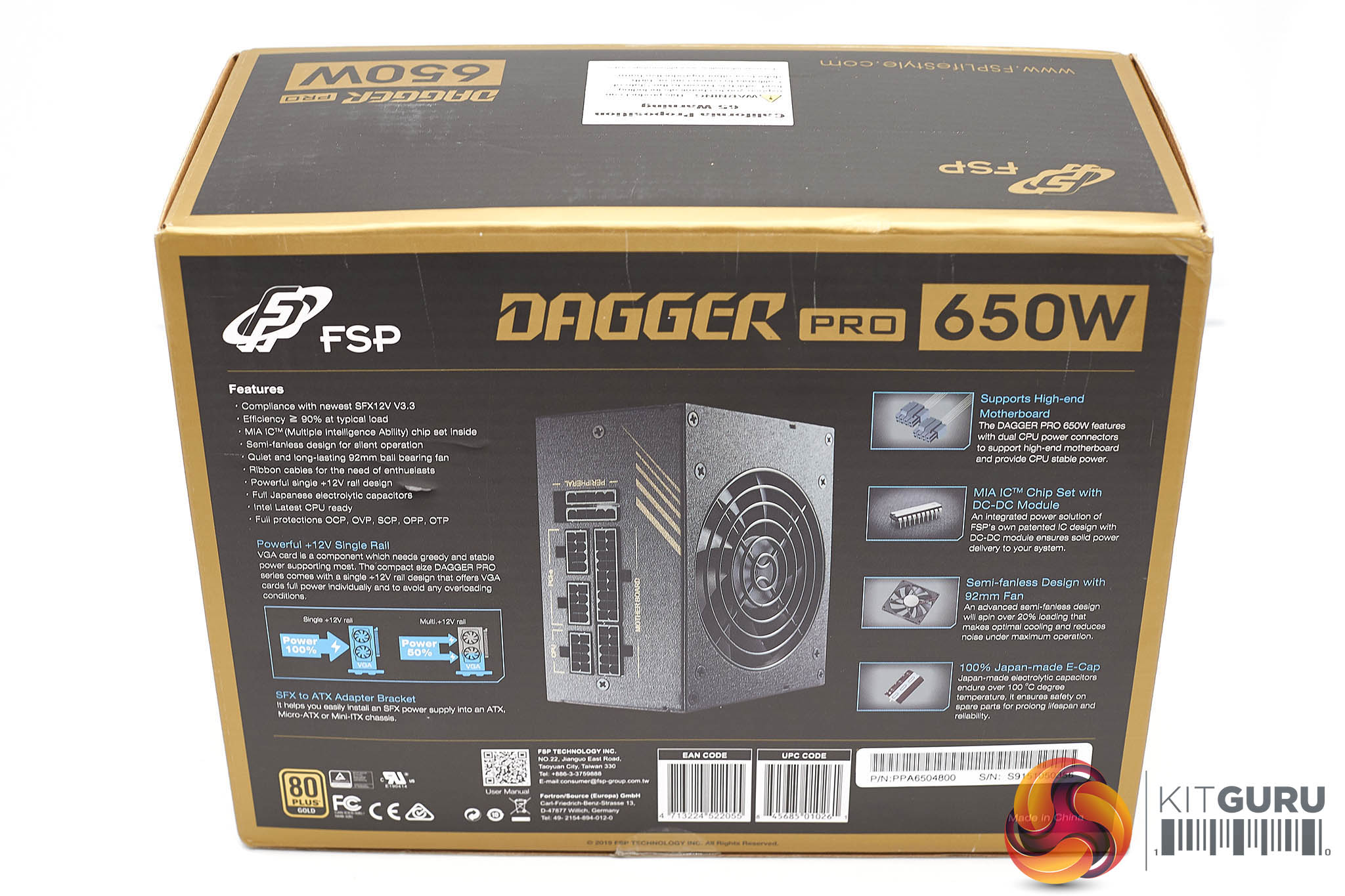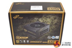The FSP Dagger PRO 650W arrives in a gold and black coloured box with a picture of the unit on the front. FSP have included a myriad of information along the bottom of the box highlighting key features – including the 7 year warranty.